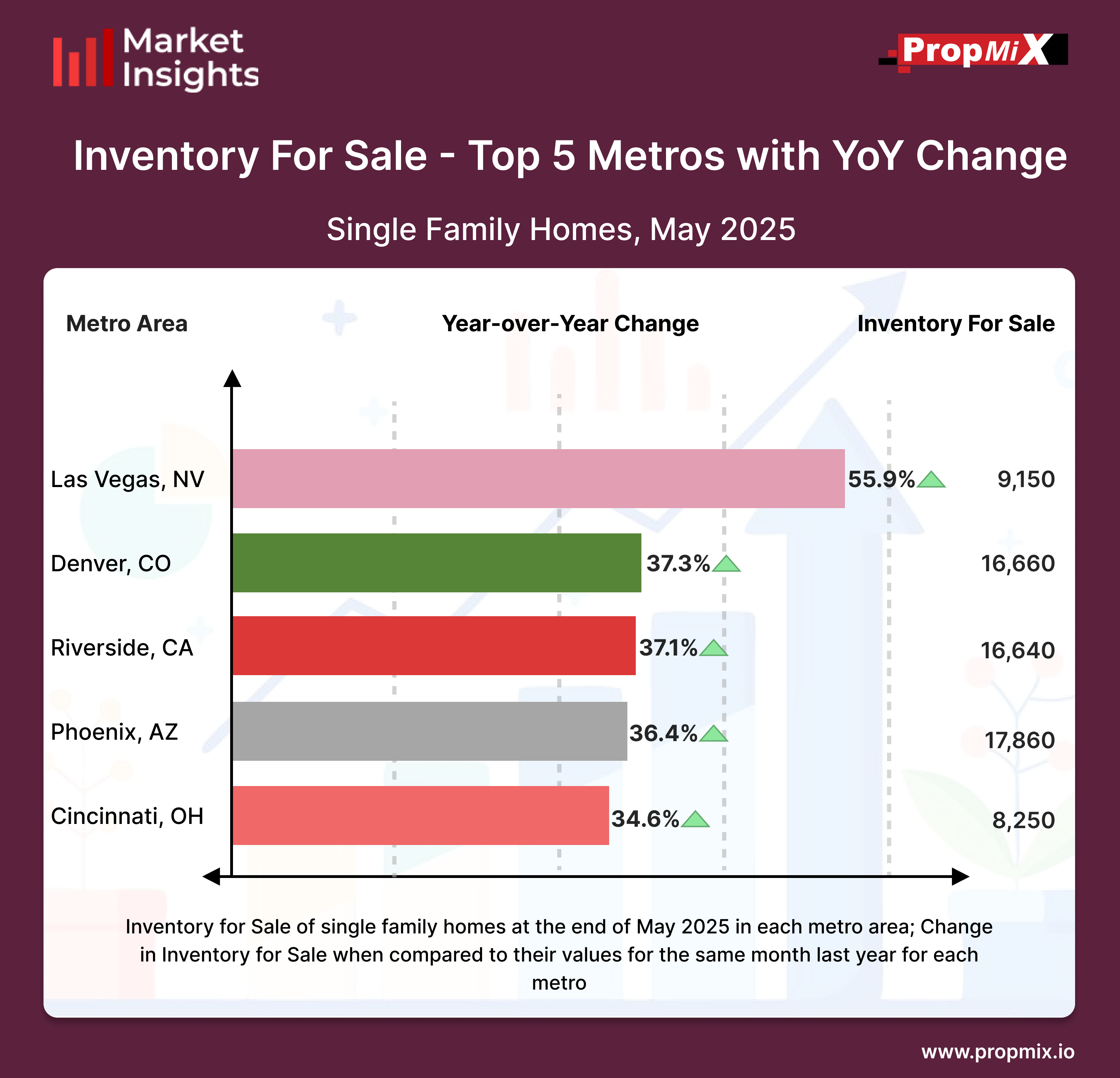 Among the top 30 U.S. metro areas, the Las Vegas, NV metro area led in year-over-year inventory growth for May 2025, posting a 55.9% increase and offering approximately 9,150 homes for sale. The Denver, CO metro area followed with a 37.3% rise, totaling around 16,660 available units. The Riverside, CA metro area recorded a 37.1% increase, bringing its inventory to about 16,640 homes. The Phoenix, AZ metro area experienced a 36.4% growth, reaching nearly 17,860 homes on the market. Rounding out the top five, the Cincinnati, OH metro area saw a 34.6% year-over-year increase, with an inventory of roughly 8,250 homes.