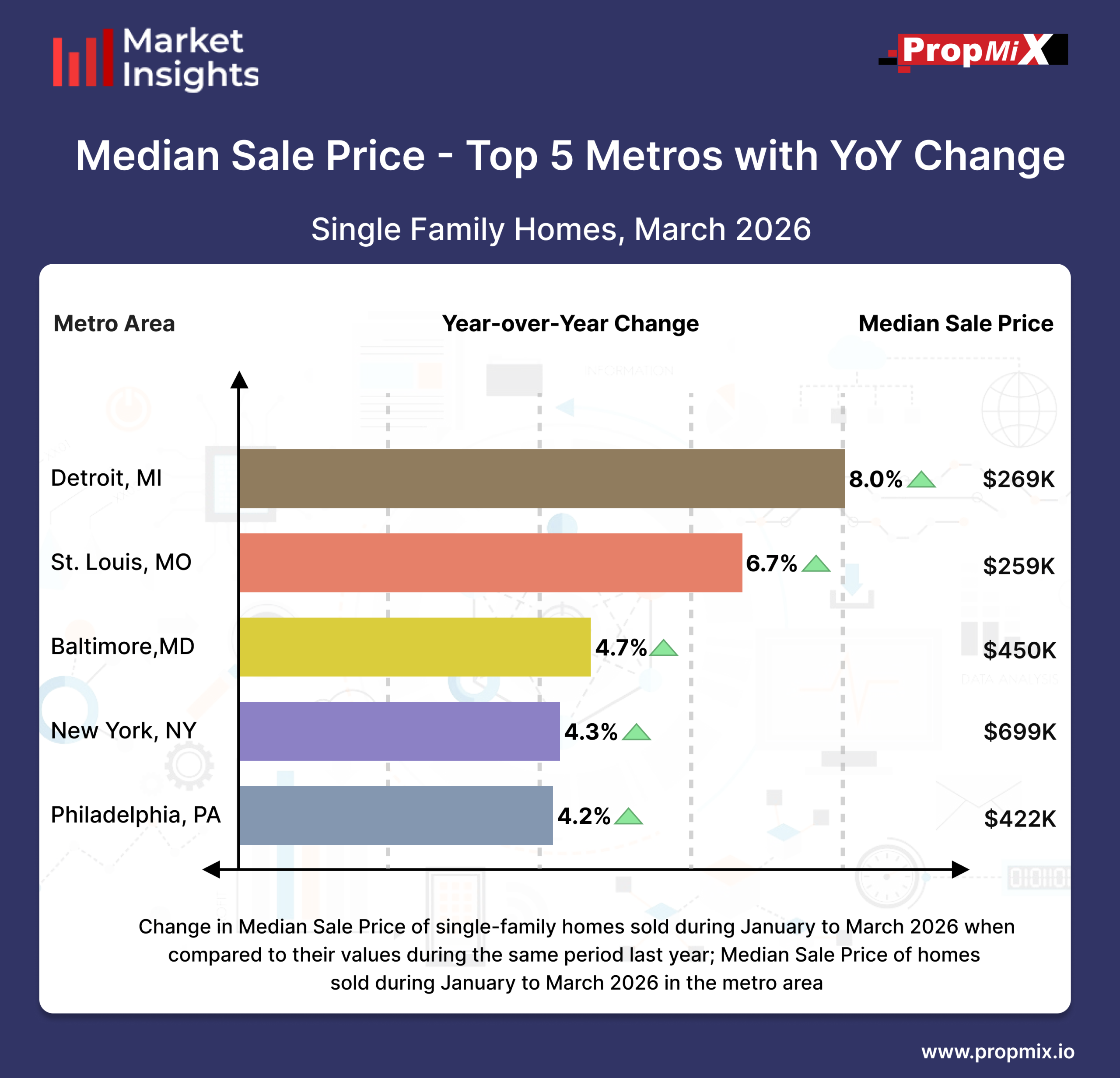 From January to March 2026, the Detroit metro area led major U.S. markets in home price growth, with its median sale price rising to $269K an 8.0% increase compared to the same period last year. St. Louis followed with a 6.7% year-over-year gain, reaching a median price of $259K. In the Baltimore metro area, median home prices climbed 4.7% year-over-year to $450K. The New York metro area saw a 4.3% increase, with prices reaching $699K, while Philadelphia recorded a 4.2% rise, bringing its median sale price to $422K.
