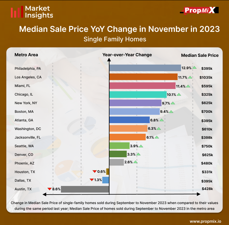 Among the top 15 metro areas, Philadelphia took the lead position with a 12.9% increase in median home prices during September to November 2023, reaching $395,000. Meanwhile, in the Austin metro area, the median home prices show a decrease of 8.6% compared to the same period last year, with a value of $428,000