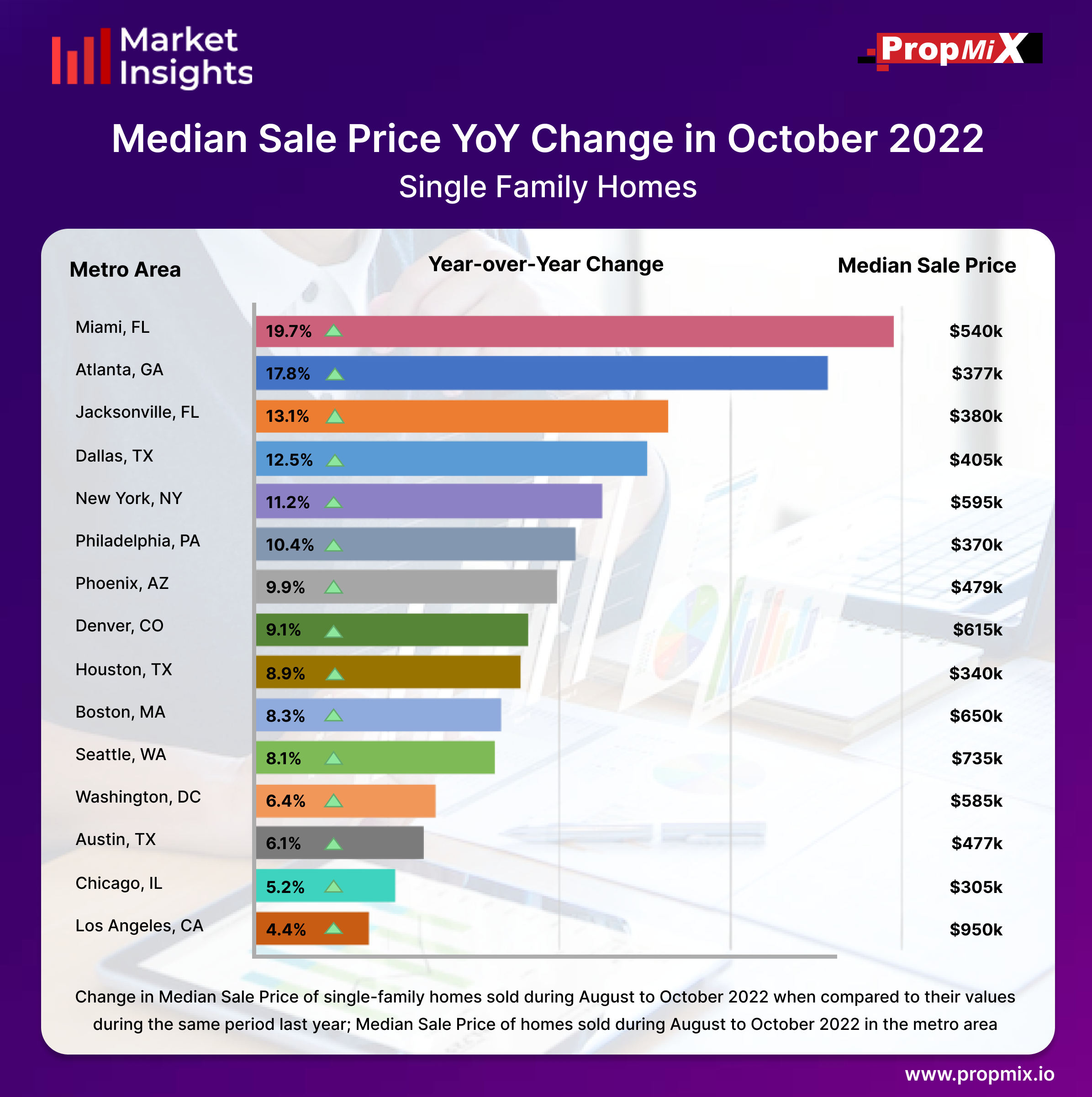The median sale price of single-family homes sold in Miami metro area had the highest YoY rise during the period from August to October 2022 having a median sale price of $540,000.