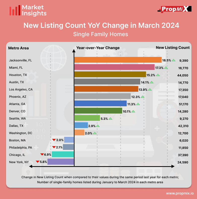 Varied trends emerged in the top 15 metro areas during the first quarter of 2024 in terms of YoY changes in new listings count compared to the previous year. Jacksonville led with a notable 18.5% increase, totalling 9,390 new listings, while New York saw a decline of 5.8%, with 24,590 new listings. Miami, Austin, Los Angeles, and Houston displayed promising increases in property listings ranging from 14.1% to 17.2%, indicating strong activity in their real estate markets. Conversely, Denver and Seattle experienced more moderate increases, with Dallas and Washington showing smaller upticks. Nonetheless, Chicago faced a decline of 4.9%, with 37,390 new listings.