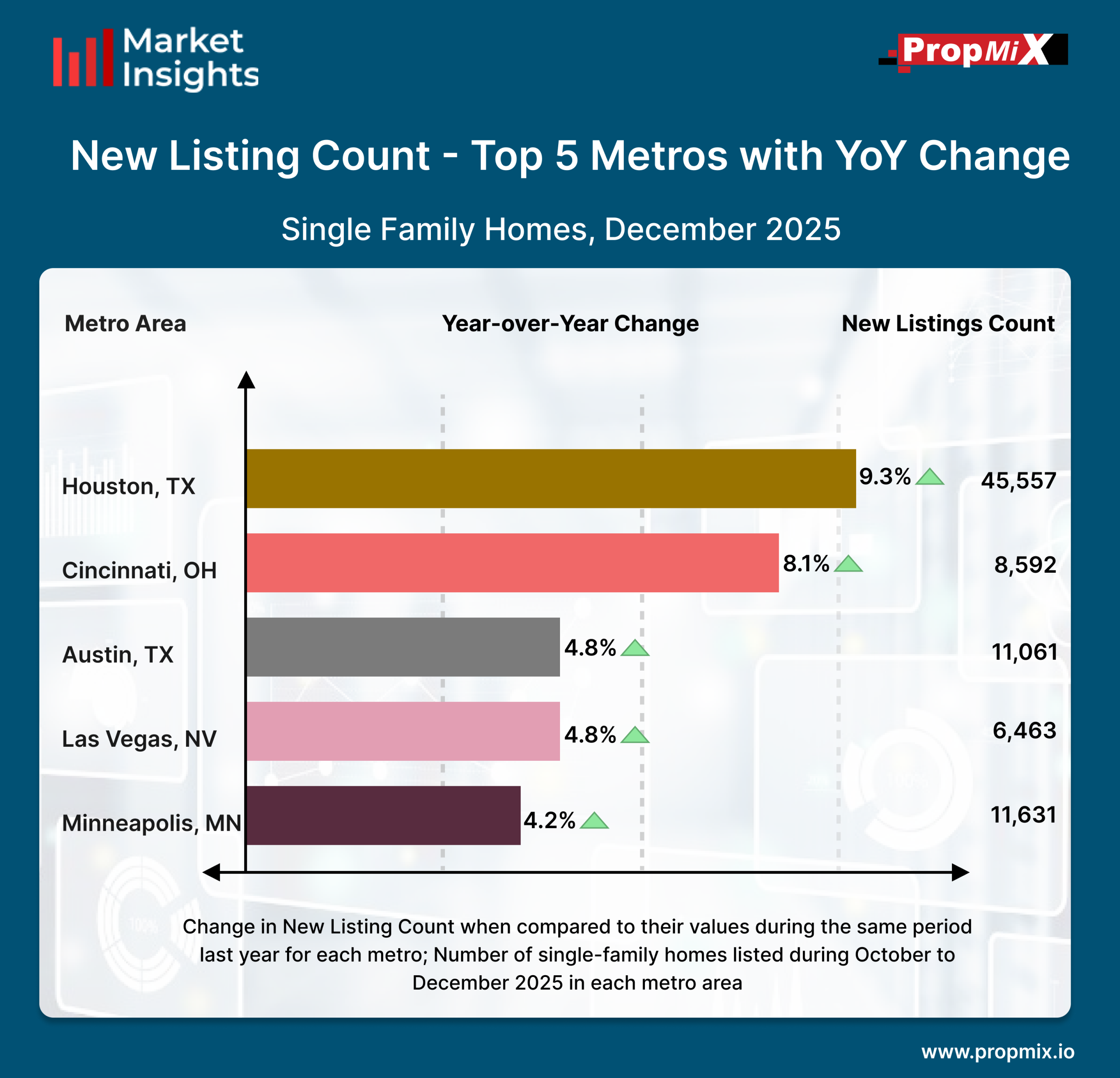 December 2025 data captures year-over-year variation in new residential listings across several major U.S. metro areas. The Houston metro area continued to register the highest listing volume, reporting 45,557 new listings, which corresponds to a 9.3% year-over-year change.Among the remaining metros, Cincinnati recorded 8,592 new listings, reflecting an 8.1% YoY difference. Austin followed with 11,061 listings, showing a 4.8% year-over-year change, while Minneapolis reported 11,631 new listings, corresponding to a 4.2% YoY change. Las Vegas rounded out the group with 6,463 new listings, reflecting a 4.8% difference compared with December 2024.