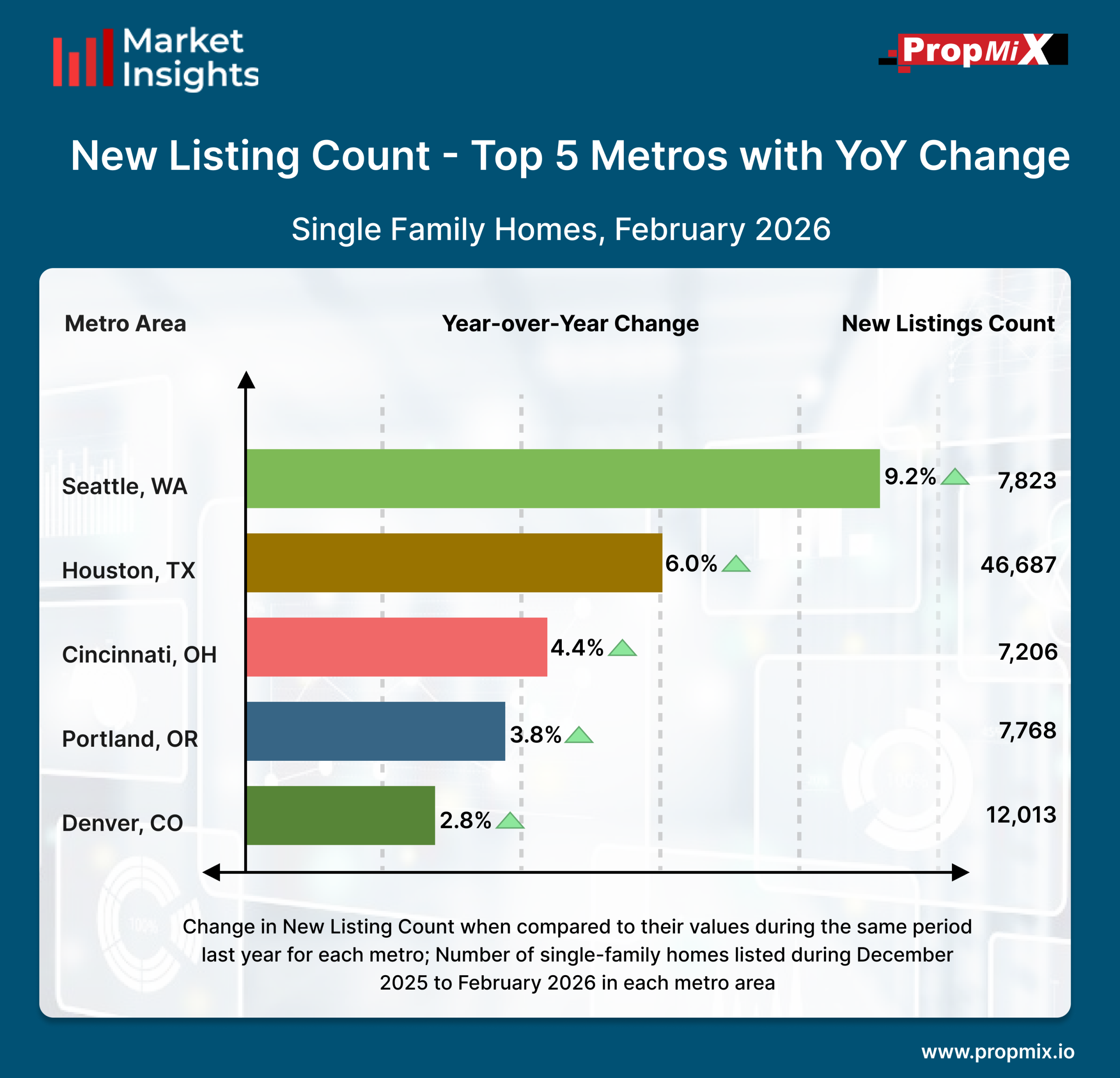 New listing activity across major U.S. metros showed steady year-over-year growth in February 2026, highlighting continued seller confidence in select markets. The Seattle, WA metro led in annual growth with 7,823 new listings, reflecting a 9.2% increase YoY. The Houston, TX metro followed with 46,687 listings, up 6.0% year-over-year. Cincinnati, OH recorded 7,206 new listings, marking a 4.4% rise, while Portland, OR saw 7,768 listings, showing a 3.8% increase. Denver, CO rounded out the list with 12,013 new listings, representing a 2.8% gain compared to February last year.