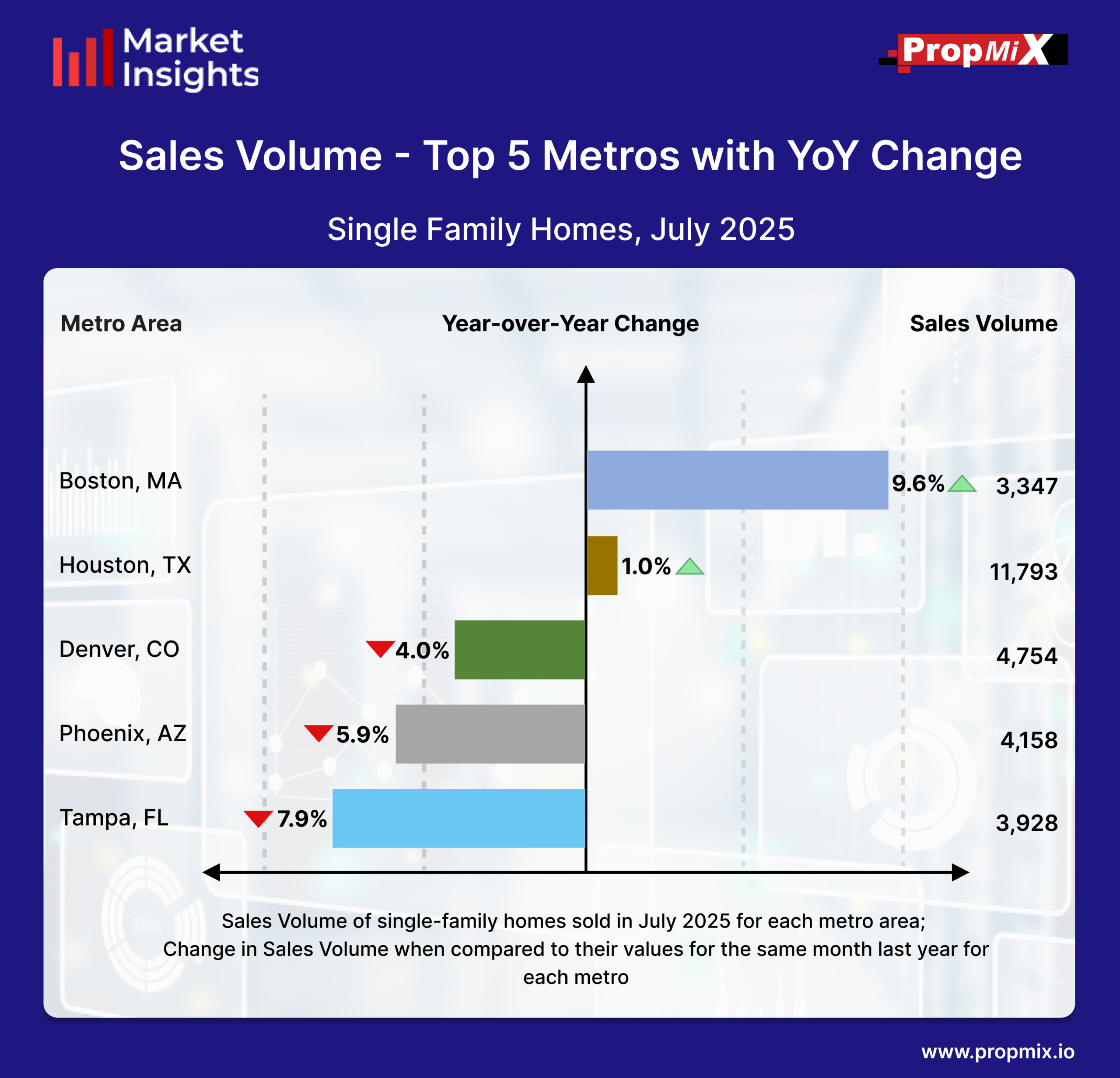 In July 2025, among the top 30 U.S. metro areas, the Boston metro area led with a 9.6% year-over-year increase in sales volume, recording 3,347 homes sold. Meanwhile, the Houston metro area saw a modest 1.0% increase, with 11,793 homes sold.