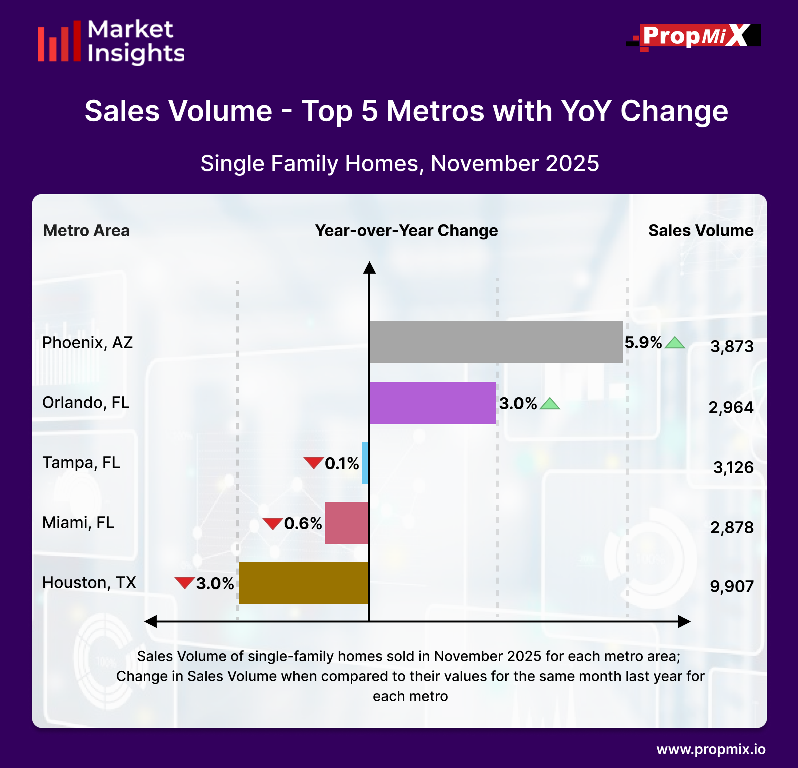 November 2025 data indicates diverging trends across major U.S. metros, as year-over-year sales gains in select markets contrasted with mild pullbacks in others. The Phoenix metro area led the group with a 5.9% year-over-year increase, recording 3,873 closed sales, reflecting improving transaction activity toward the end of the year. The Orlando metro area followed with a 3.0% YoY rise and 2,964 sales, indicating steady buyer participation.Performance was more subdued in other large metros. The Tampa metro area remained nearly flat, posting a 0.1% year-over-year decline with 3,126 transactions. Similarly, the Miami metro area saw sales dip 0.6% YoY, totaling 2,878 closings. The Houston metro area recorded the most notable contraction, with sales down 3.0% year over year to 9,907 transactions, highlighting softer demand compared to last year.