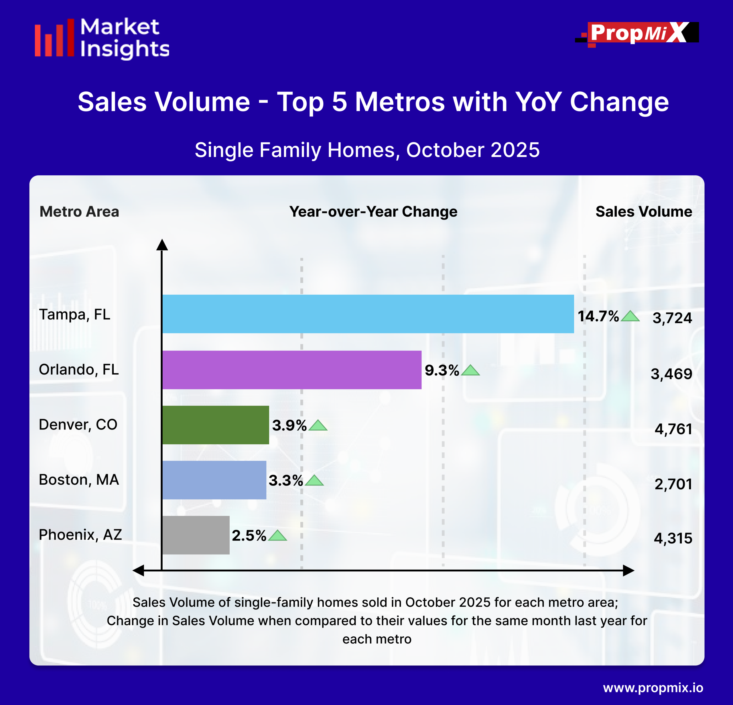 Housing activity continued to show steady improvement in October 2025, with several major metros posting consistent year-over-year gains. Tampa metro area once again led the group with a 14.7% YoY increase, reaching 3,724 closed sales its strongest October performance in recent years. Orlando metro area followed with a 9.3% rise and 3,469 transactions, reflecting stable demand across the region. Denver metro area recorded a 3.9% uptick, totaling 4,761 sales, highlighting continued buyer activity despite tightening inventory. Boston metro area continued its positive momentum with a 3.3% YoY increase and 2,701 home sales. Phoenix metro area rounded out the top five with a 2.5% rise, achieving 4,315 sales as market conditions steadily normalized.