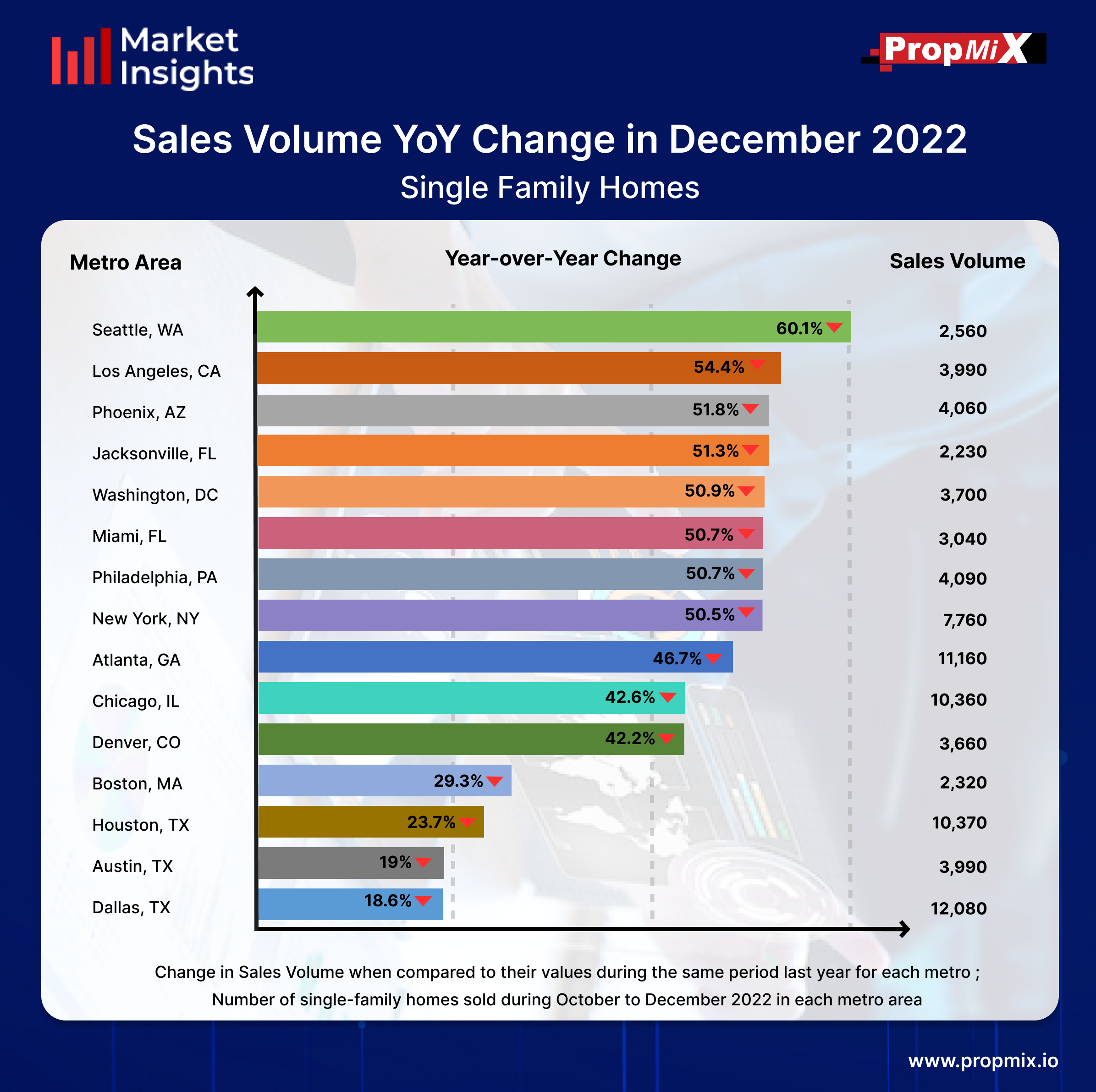 Change in Sales Volume YoY in December 2022 01/09/2023 PropMix Data Analytics Team Market Insights 0 The Seattle metro area experienced the largest YoY decline in sales volume, falling by 60.1% from the same time last year. However, the Dallas metro area had the highest number of single-family homes sold between October and December 2022 having a sales volume of 12,080. Learn more about the metrics in PropMix Market Insights.