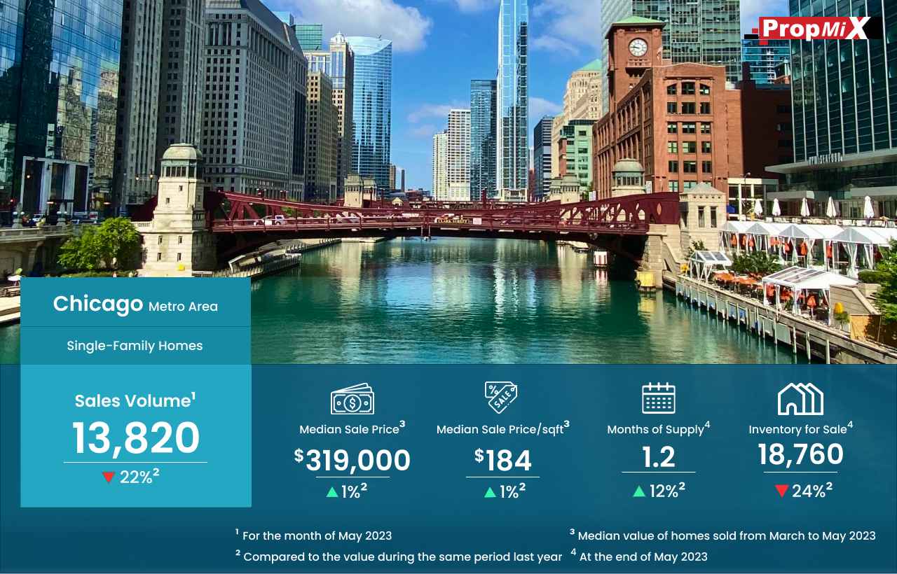 Home sales volume took a sharp plunge of 22% in the Chicago metro area during May 2023, with only 13,820 homes sold, marking a significant decline compared to the same month in 2022.