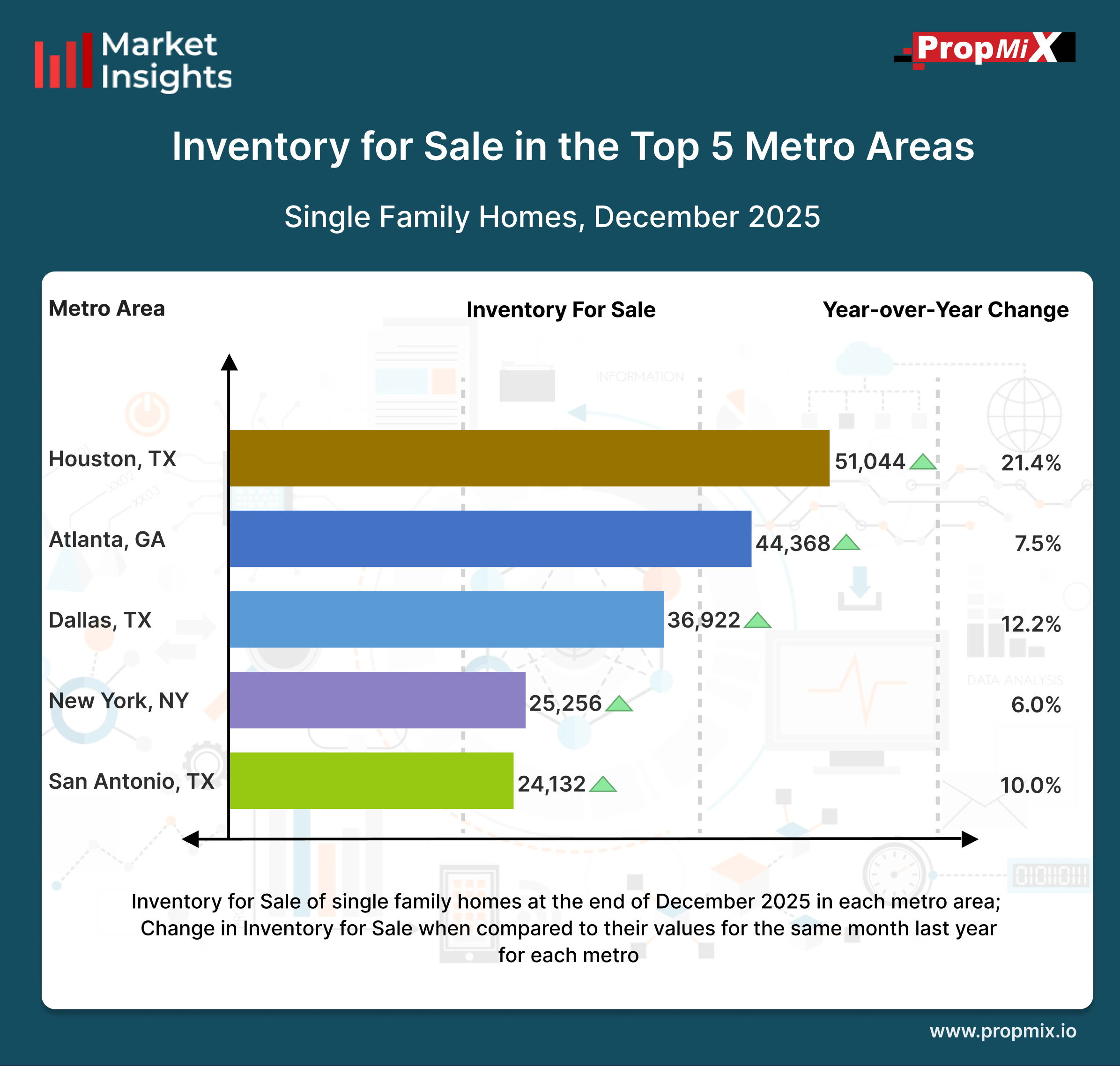 December 2025 inventory figures show year-over-year changes in active listings across several major U.S. metro areas. The Houston metro area remained the largest market by available inventory, with 51,044 homes for sale, reflecting a 21.4% year-over-year increase. Atlanta followed with 44,368 active listings, up 7.5% YoY. The Dallas metro area recorded 36,922 homes on the market, marking a 12.2% annual increase.The New York City metro area reported 25,256 homes for sale, showing a 6.0% YoY change, while San Antonio rounded out the top five with 24,132 active listings, up 10.0% year over year. Overall, December 2025 inventory data highlights continued year-over-year increases in active listings across several large U.S. housing markets.