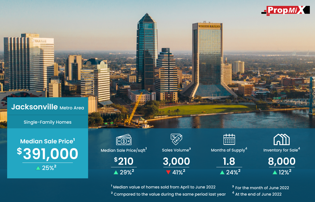 Inventory For Sale Up by 12% in Jacksonville Metro Area in June 2022 08/19/2022 PropMix Data Analytics Team Market Insights 0 The inventory for sale by the end of June 2022 in the Jacksonville metro area was 8,000, up by 12% over June 2021.The median sale price of single-family homes sold was $391,000 for the period from April to June 2022, up by 25% year-over-year. Learn more about the metrics in PropMix Market Insights.