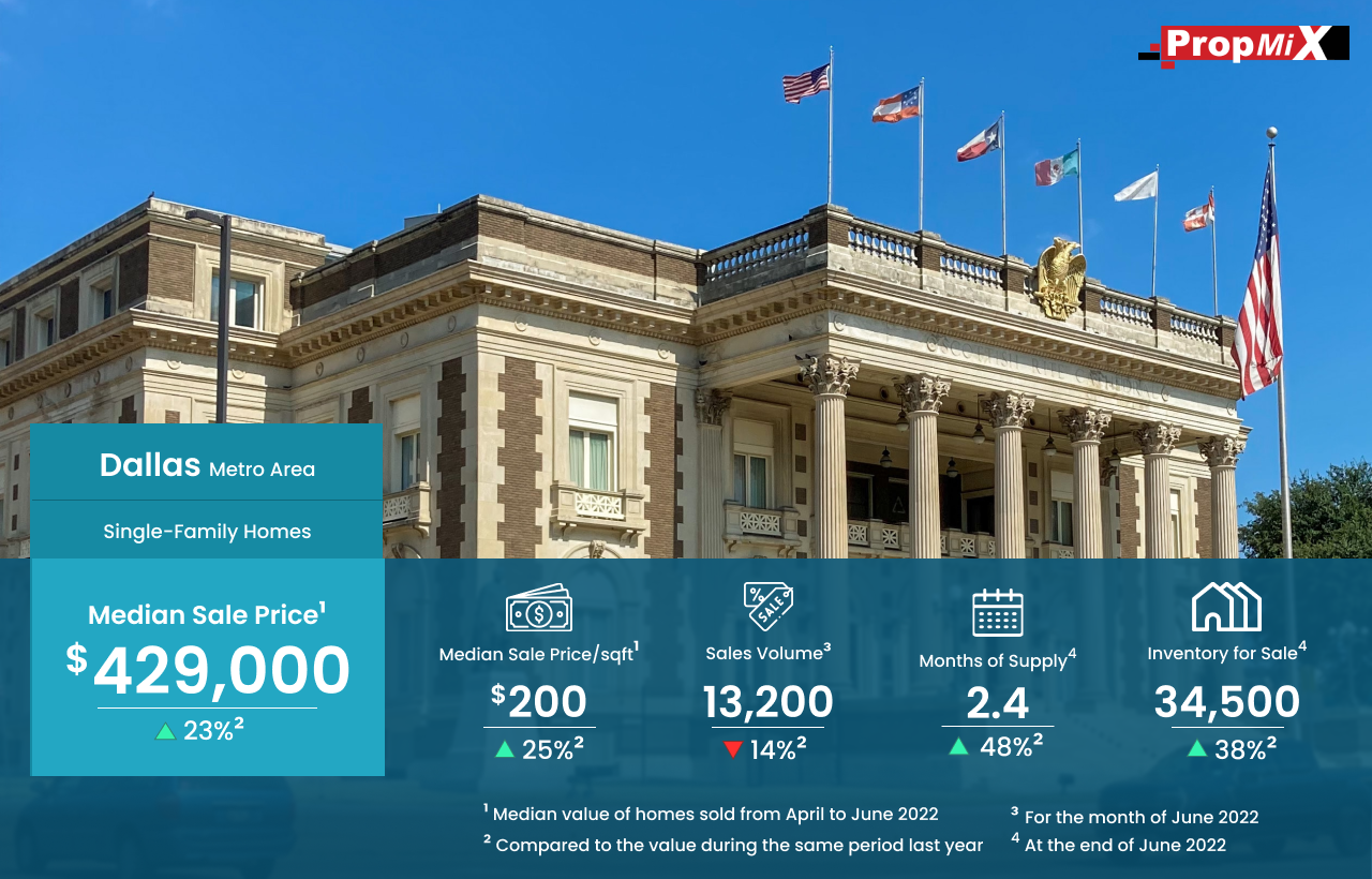 Inventory For Sale Up by 38% in Dallas Metro Area in June 2022 08/16/2022 PropMix Data Analytics Team Market Insights 0 The inventory for sale by the end of June 2022 in the Dallas metro area was 34,500, up by 38% over June 2021.The median sale price of single-family homes sold was $429,000 for the period from April to June 2022, up by 23% year-over-year. Learn more about the metrics in PropMix Market Insights.