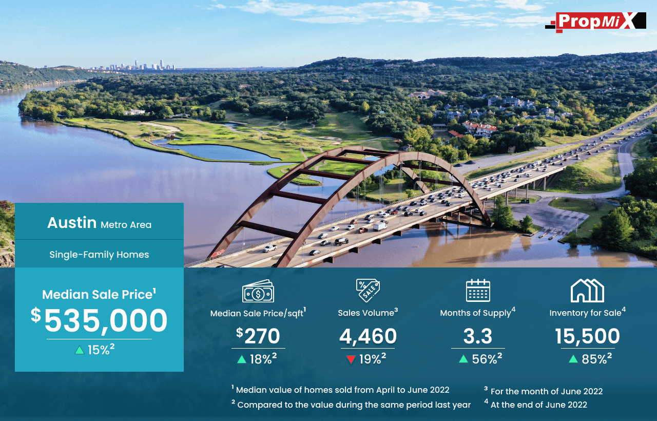 Inventory For Sale Up by 85% in Austin Metro Area in June 2022 08/11/2022 PropMix Data Analytics Team Market Insights 0 The inventory for sale by the end of June 2022 in the Austin metro area was 15,500, up by 85% over June 2021.The median sale price of single-family homes sold was $535,000 for the period from April to June 2022, up by 15% year-over-year. Learn more about the metrics in PropMix Market Insights.