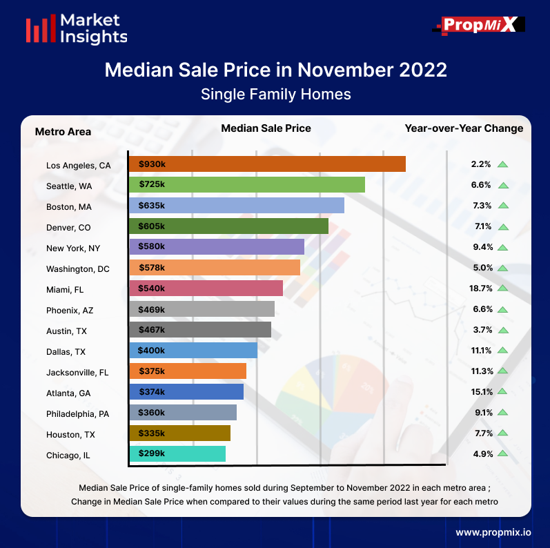 Los Angeles metro area had the highest median sale price of $930,000 for single-family homes sold during the period from Sep to Nov 2022 marking a 2.2% rise in value when compared to the same period last year.