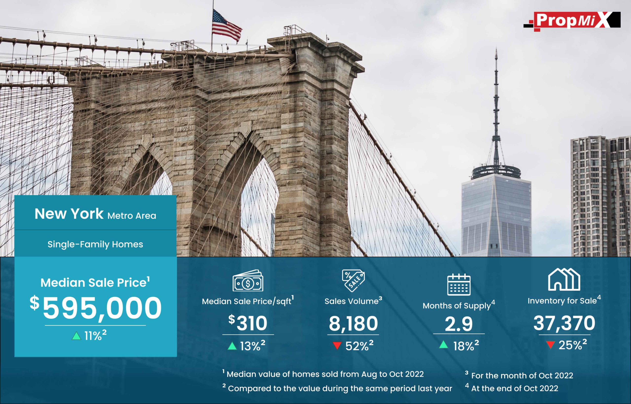 Median Sale Price Up by 11% in New York Metro Area in October 2022 11/21/2022 PropMix Data Analytics Team Market Insights 0 The median sale price of single-family homes sold in the New York metro area was $595,000 for the period from August to October 2022, up by 11% year-over-year. Learn more about the metrics in PropMix Market Insights.
