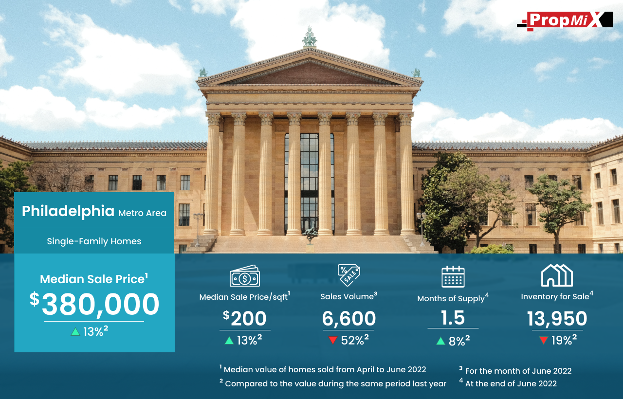 Median Sale Price Up by 13% in Philadelphia Metro Area in June 2022 08/15/2022 PropMix Data Analytics Team Market Insights 0 The median sale price of single-family homes sold in the Philadelphia metro area was $380,000 for the period from April to June 2022, up by 13% year-over-year. Learn more about the metrics in PropMix Market Insights.