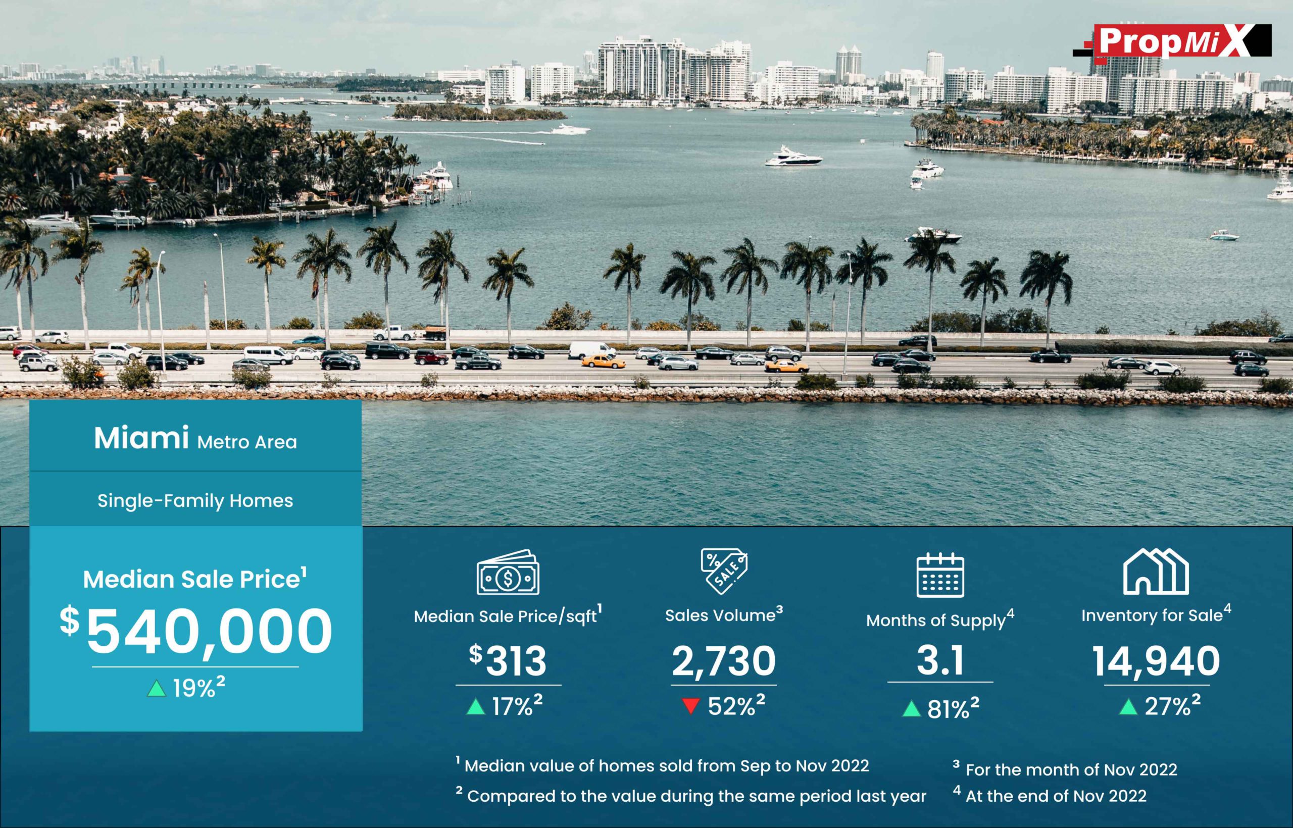 Median Sale Price Up by 19% in Miami Metro Area in November 2022 12/22/2022 PropMix Data Analytics Team Market Insights 0 The median sale price of single-family homes sold in the Miami metro area was $540,000 for the period from September to November 2022, up by 19% year-over-year. Learn more about the metrics in PropMix Market Insights.