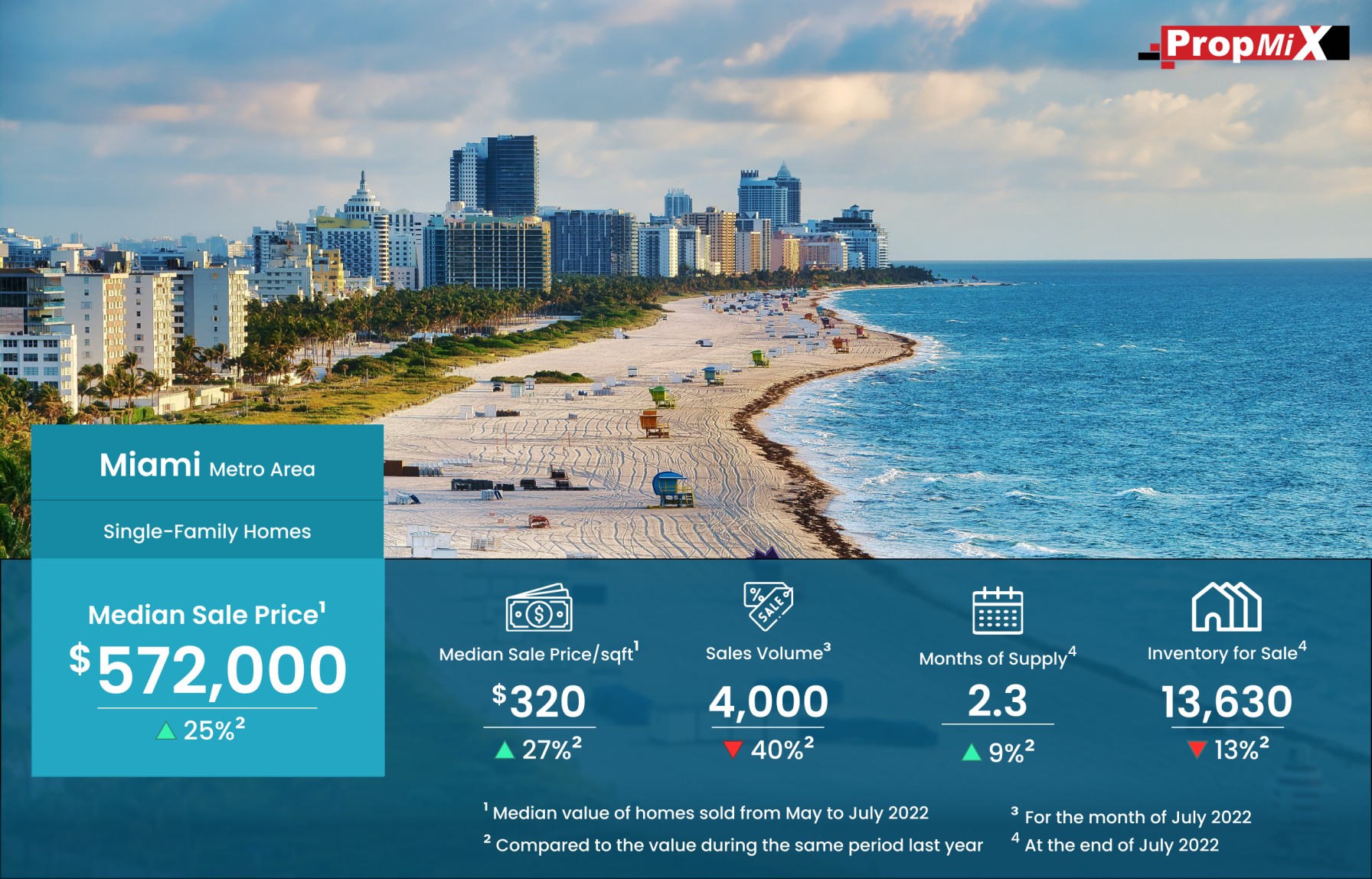 Median Sale Price Up by 25% in Miami Metro Area in July 2022 09/12/2022 PropMix Data Analytics Team Market Insights 0 The median sale price of single-family homes sold in the Miami metro area was $572,000 for the period from May to July 2022, up by 25% year-over-year. Learn more about the metrics in PropMix Market Insights.
