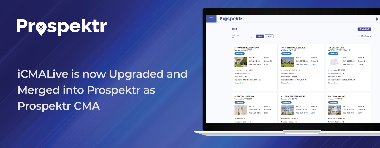 iCMALive has now been fully upgraded and integrated into Prospektr as Prospektr CMA, giving agents and loan officers the ability to create Comparative Market Analyses instantly. With a Prospektr account, users can now generate a CMA by simply entering the property address.