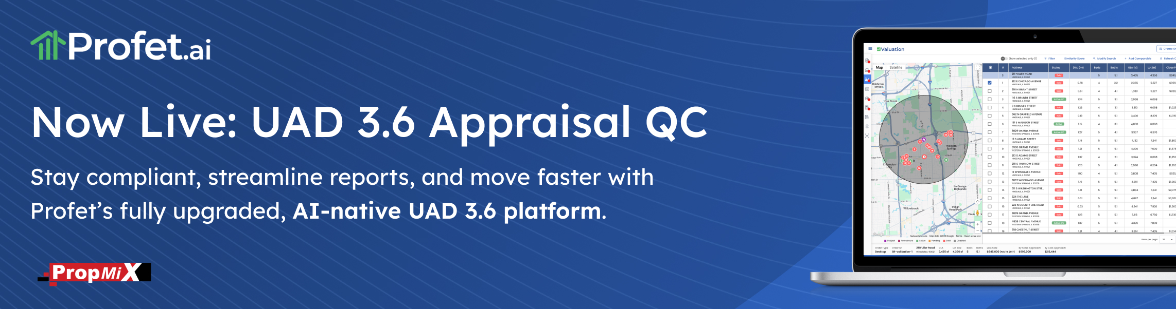 Coming soon, our Valuation platform will also generate complete UAD 3.6 submission packages – including the appraisal PDF, supporting images, and MISMO XML – in a ready-to-deliver zip file. Built on an AI-native platform enriched with MLS and assessor data, Profet.ai helps valuation professionals modernize their workflow and stay ahead of evolving GSE mandates.