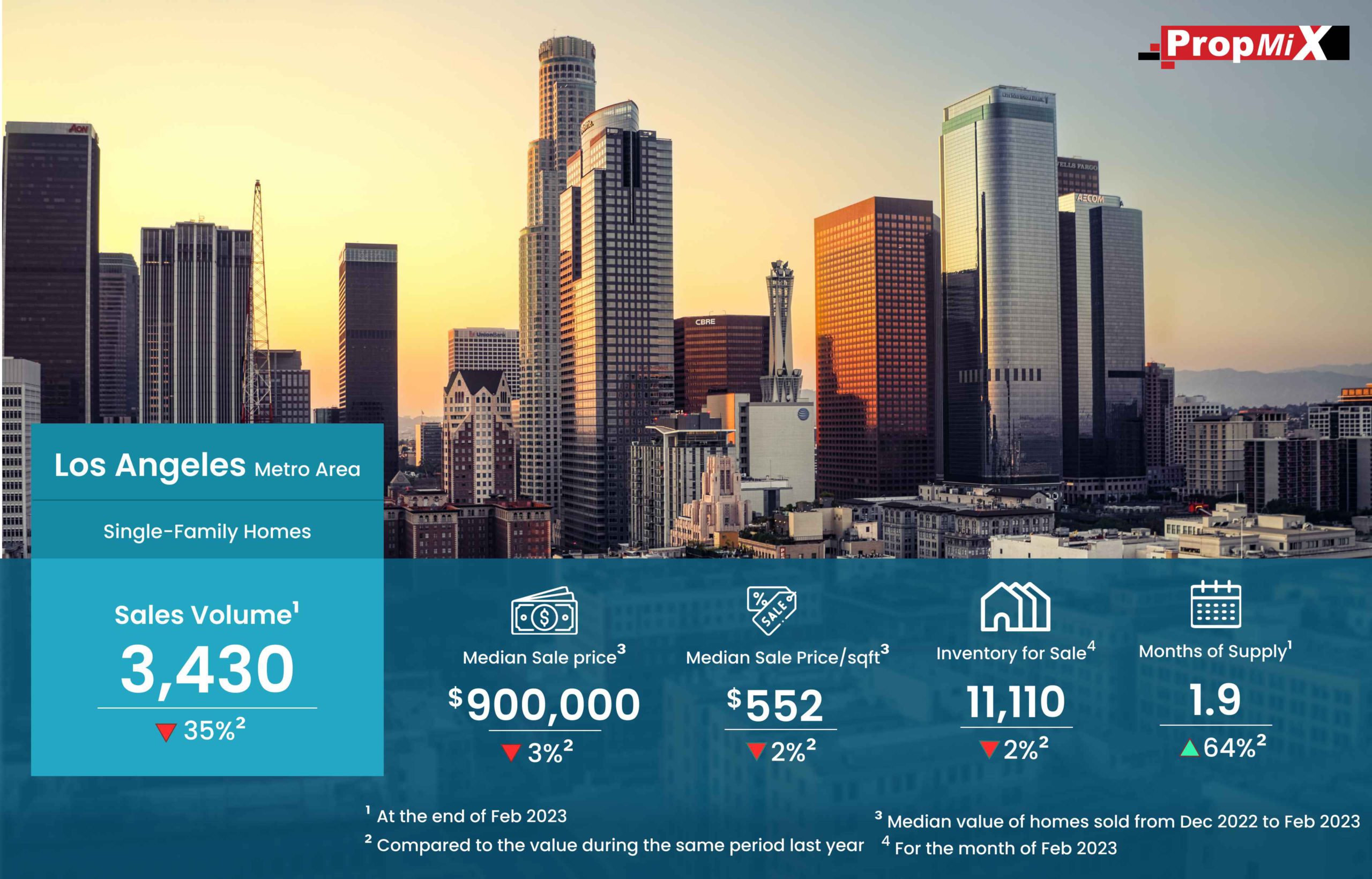 The volume of single family homes sold in Los Angeles metro area has dropped by 35% in Feb 2023 when compared to the same month in 2022. There were 3,430 homes sold during Feb 2023.