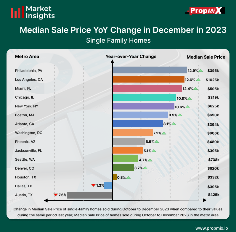 Median sale price in the Los Angeles metro area increased by 12.6% from October to December 2023, reaching $1,025,000. At the same time, among the top 15 metro areas, the Austin metro area experienced a 7.6% decrease in median home price compared to the same period last year, with a value of $425,000.