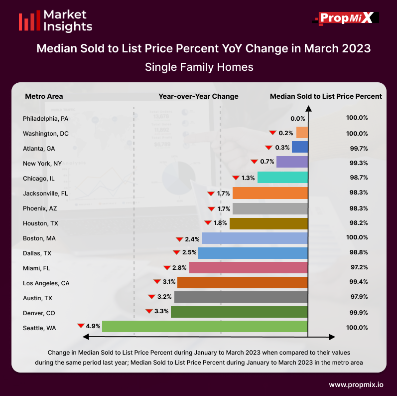 In March 2023, the Seattle metropolitan area exhibited the largest decrease in Median Sold to List Price Percent among the top 15 metro regions. The recorded decline amounted to 4.9% as compared to the corresponding period in the previous year.