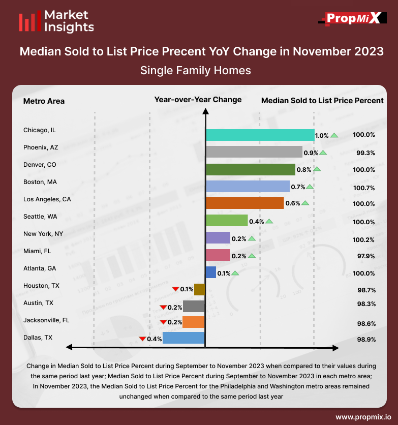Among the top 15 metro areas, Chicago witnessed the highest rise of 1% in the Median Sold to List Price Percentage during September to November 2023. In contrast, over the same period, Dallas observed a 0.4% decrease compared to the corresponding time frame in November 2022.