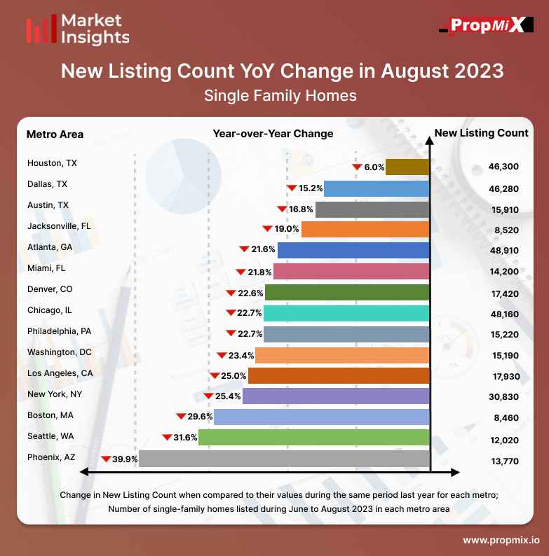 Houston metro area experienced a 6.0% decline in new property listings from June to August 2023, with a total of 46,300 new homes listed. During the same period, among the top 15 metro areas, the Phoenix metro area saw the biggest drop of 39.9% in new homes listed for sale when compared to August 2022, with only 13,770 single-family homes listed.