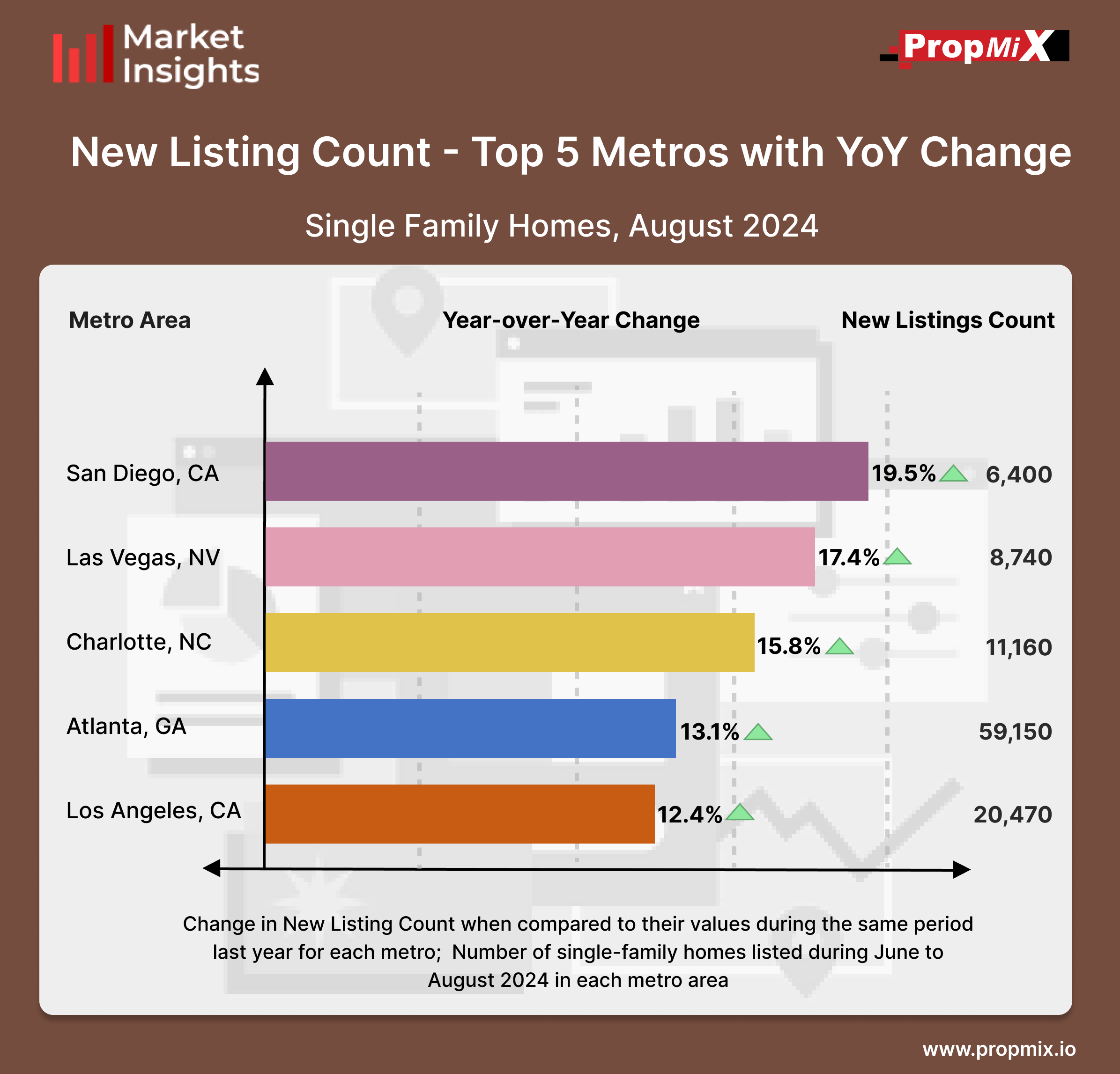 Among 30 major U.S. metro areas, San Diego, Las Vegas, Charlotte, Atlanta, and Los Angeles metro areas experienced the highest YoY percentage changes in new listings from June to August 2024. San Diego metro area led with a YoY increase of 19.5% in new listings, totaling 6,400. Las Vega metro area followed with a 17.4% YoY rise and 8,740 new listings. Charlotte and Atlanta metro areas noted YoY increases of 15.6% and 13.1% respectively. Los Angeles metro area also saw an increase of 14.5%, with 20,470 new listings.