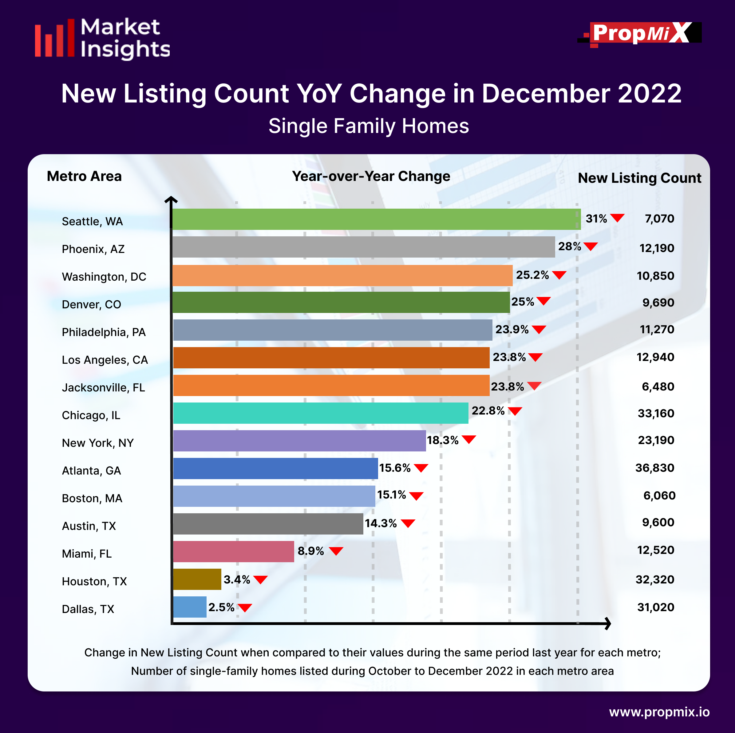 Seattle metro area experienced the largest year-over-year decline in new listing count, down by 31% from the same time last year