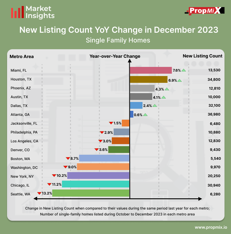 Among the top 15 metro areas, the Miami metro area maintained its position by experiencing the highest increase, with a rise of 7.6% in new property listings from October to December 2023. Meanwhile, during the same period, Washington experienced a decline of 9.0% in new homes listed compared to December 2022, with 9,970 single-family homes listed.