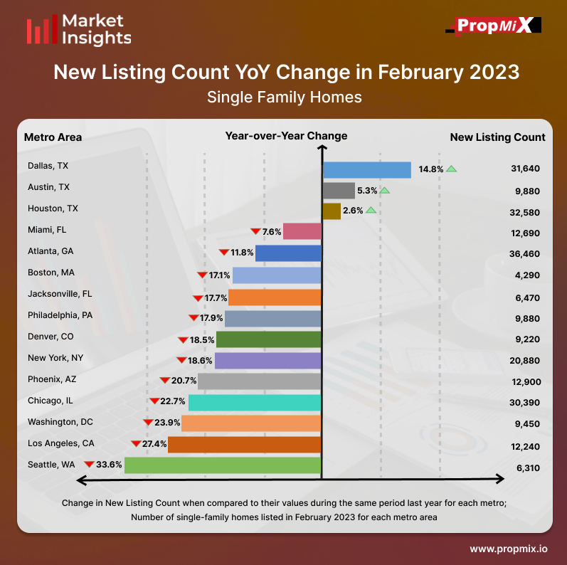 Meanwhile, Seattle metro area shows the highest decline in the YoY change in new listing count. There were 6,310 single-family homes listed in February 2023, with a drop of 33.6% in the period between Dec 2022 and Feb 2023 when compared to the same period last year.