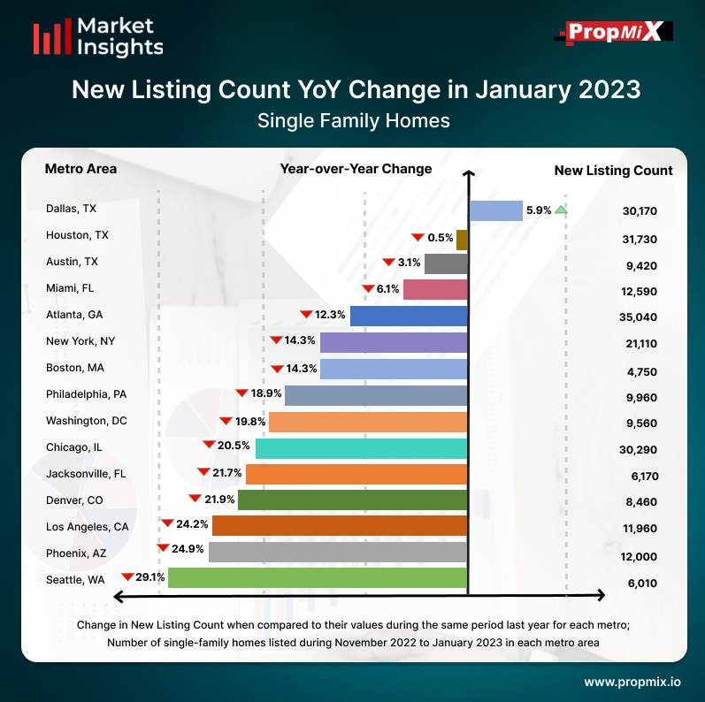 At the same time, Atlanta metro area stood up with highest number of single-family homes listed for the period from Nov 2022 to Jan 2023, with a new listing count of 35,040.
