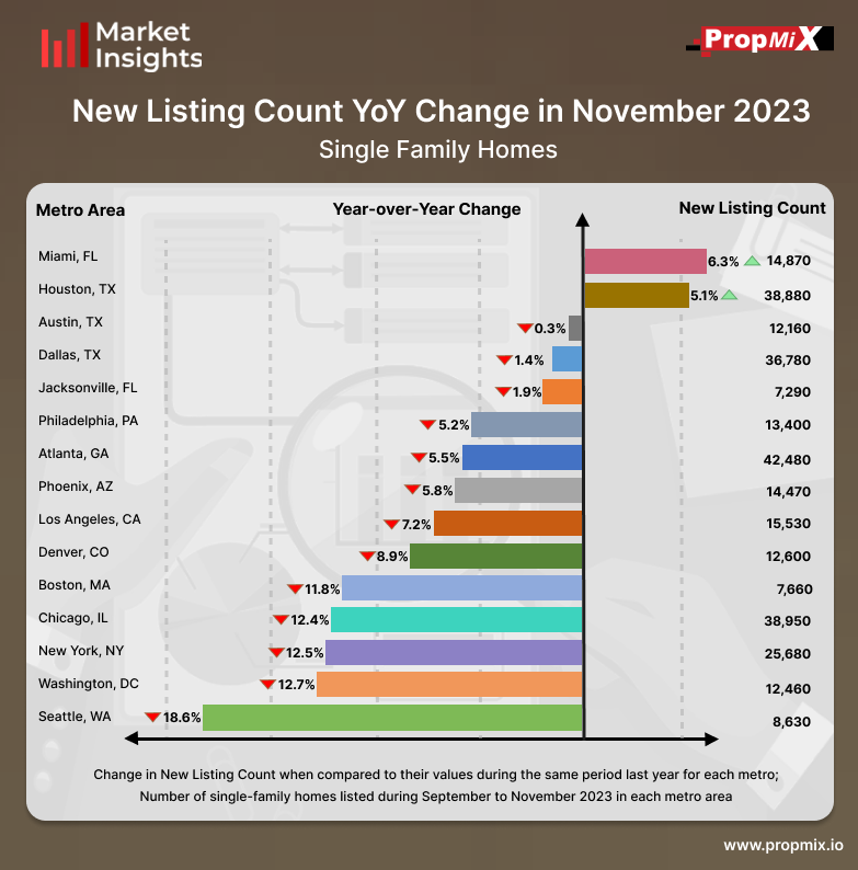 Among the top 15 metro areas, Miami experienced the highest increase, with a 6.3% rise in new property listings from September to November 2023. Meanwhile, during the same period, Seattle experienced the steepest decline, with an 18.6% drop in new homes listed compared to November 2022, with 8,630 single-family homes listed.