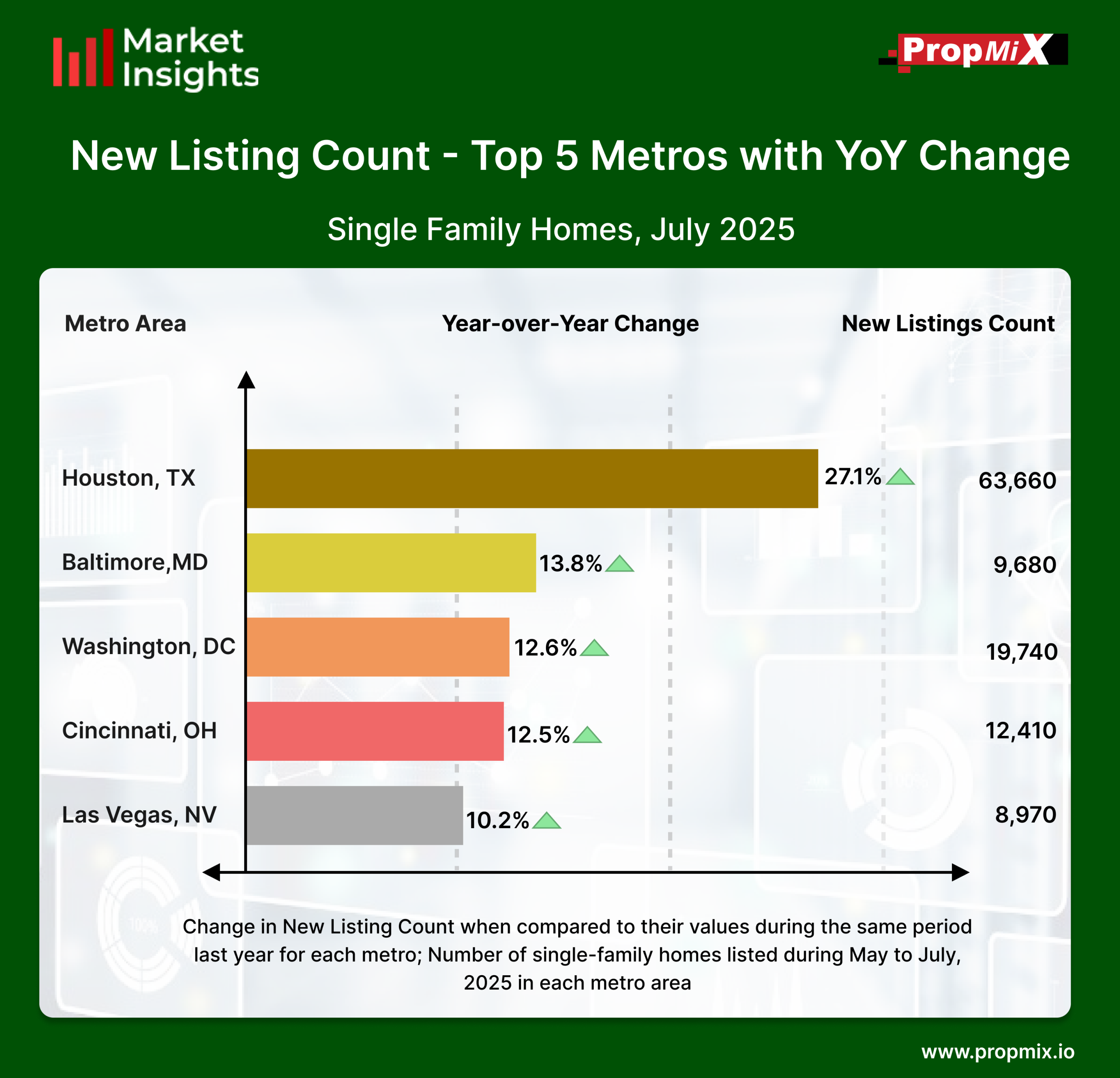 During July 2025, the Houston metro area once again led all top 30 U.S. markets in new listing growth, with a 27.1% year-over-year increase and 63,660 properties added. The Baltimore metro area followed with a 13.8% rise and 9,680 new listings. The Washington, DC metro area recorded a 12.6% increase, adding 19,740 properties. The Cincinnati metro area saw a 12.5% growth with 12,410 new listings, while the Las Vegas metro area experienced a 10.2% increase with 8,970 properties added.