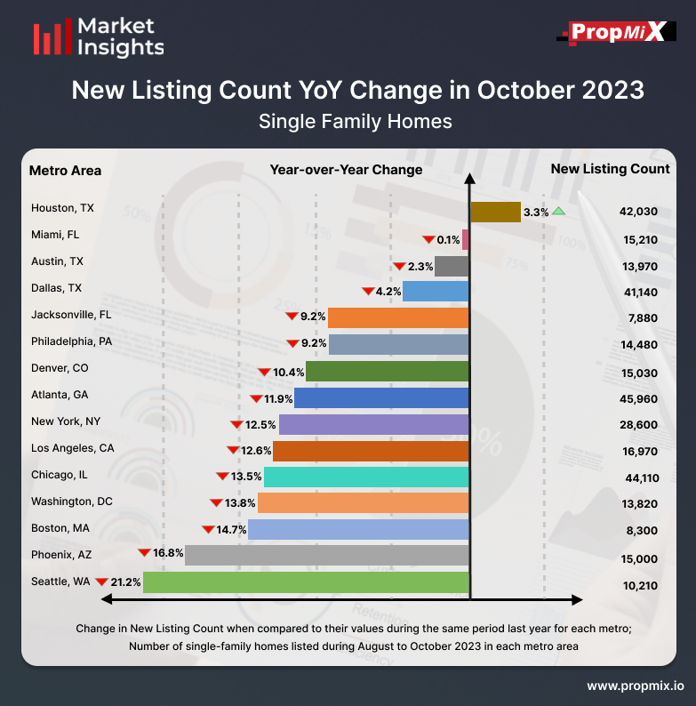 Houston witnessed the highest increase, with 3.3% rise in new property listings among the top 15 metro areas from August to October 2023. Meanwhile, during the same time period, Atlanta experienced a drop of 11.9% in new homes listed when compared to October 2022, with 45,960 single-family homes listed.