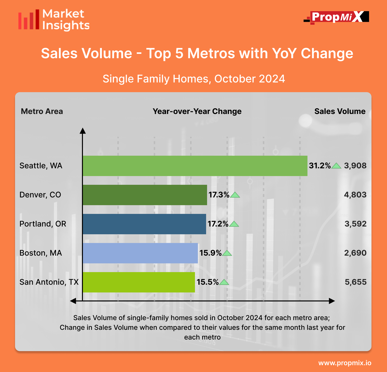 Among the top 30 metro areas in the US, the Seattle metro area had the highest year-over-year sales growth in October 2024, increasing by 31.2% with 3,908 sales. Following closely, the Denver metro area rose up 17.3% with 4,803 sales, and the Portland metro area recorded a 17.2% increase with 3,592 sales. The Boston metro area saw a 15.9% rise with 2,690 sales, while the San Antonio metro area came fifth with 15.5% growth, achieving 5,655 sales.