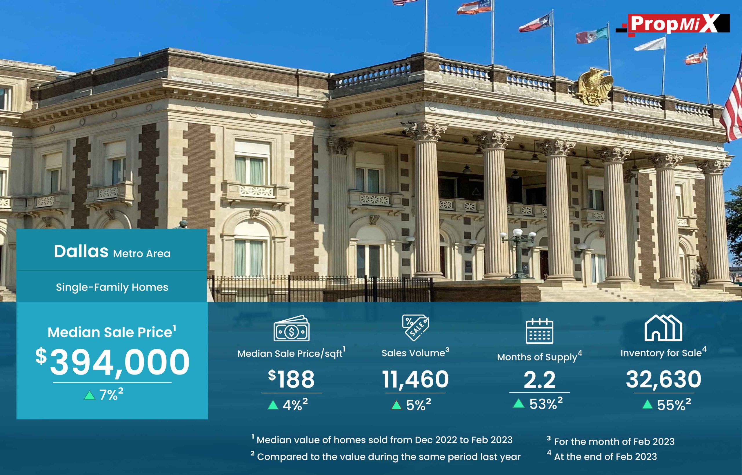 From December 2022 to February 2023, the Dallas metro area experienced a 7% increase in the median sale price of single-family homes sold compared to the previous year, with the median sale price hitting $394,000.