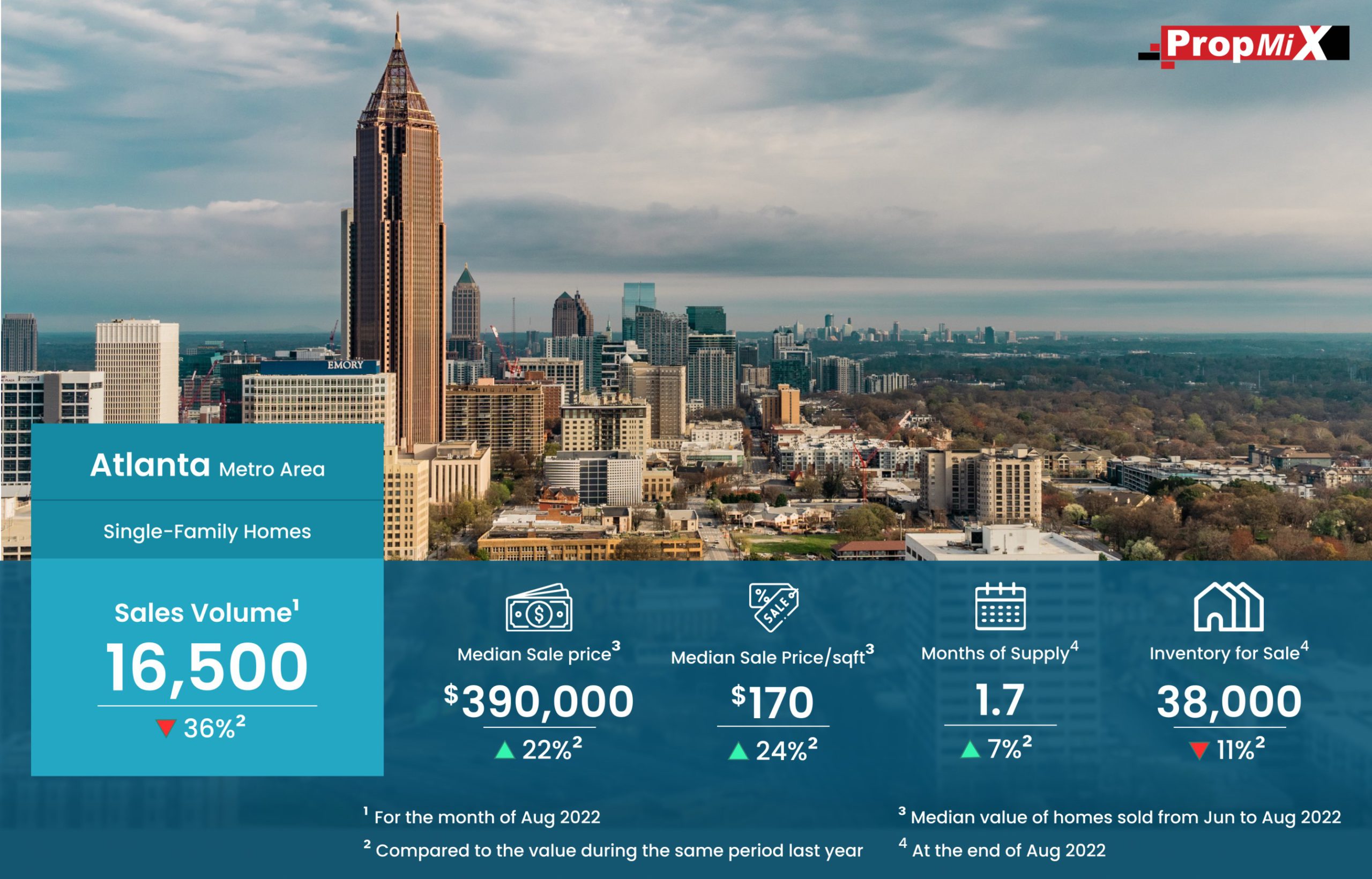 Home Sales Down by 36% in Atlanta Metro Area in August 2022 09/29/2022 PropMix Data Analytics Team Market Insights 0 The number of single-family homes sold in Atlanta metro area in August 2022 was 16,500, a dip of 36% over August 2021. Learn more about the metrics in PropMix Market Insights.