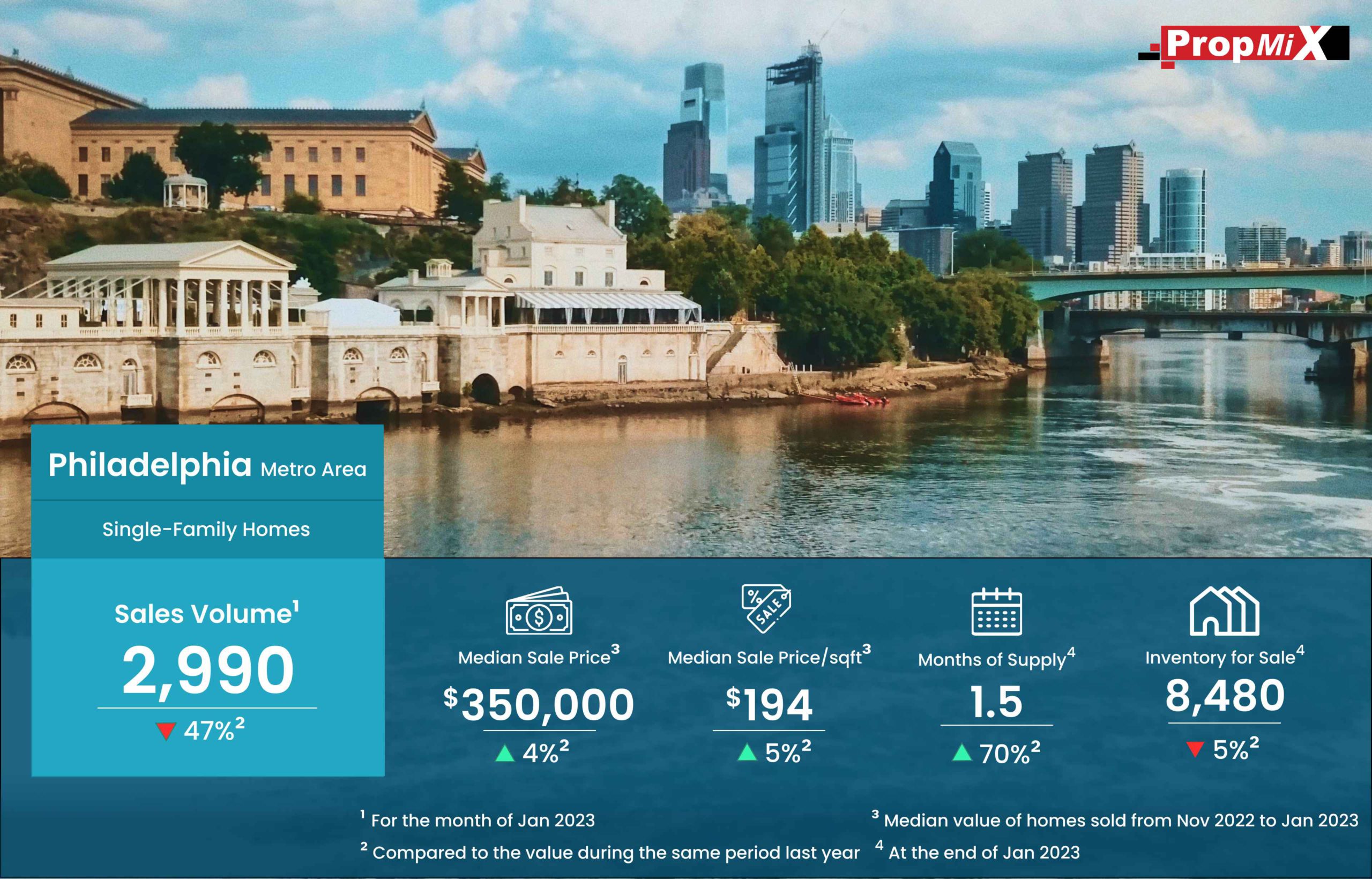 Home Sales in Philadelphia Metro Area Saw a Dip of 47% During January 2023 02/02/2023 PropMix Data Analytics Team Market Insights 0 Philadelphia metro area had 2,990 single-family homes sold during January 2023 with a fall of 47% over January 2022. At the same time, the months of supply jumped 70% more during the same period. Learn more about the metrics in PropMix Market Insights.