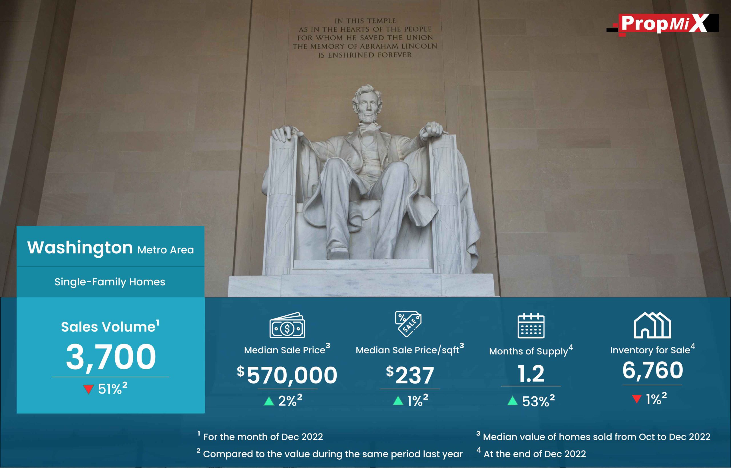 Home Sales in Washington Metro Area Saw a Dip of 51% During December 2022 01/19/2023 PropMix Data Analytics Team Market Insights 0 Washington metro area had 3,700 single-family homes sold during December 2022 with a fall of 51% over December 2021. At the same time, the months of supply jumped 53% more during the same period. Learn more about the metrics in PropMix Market Insights.
