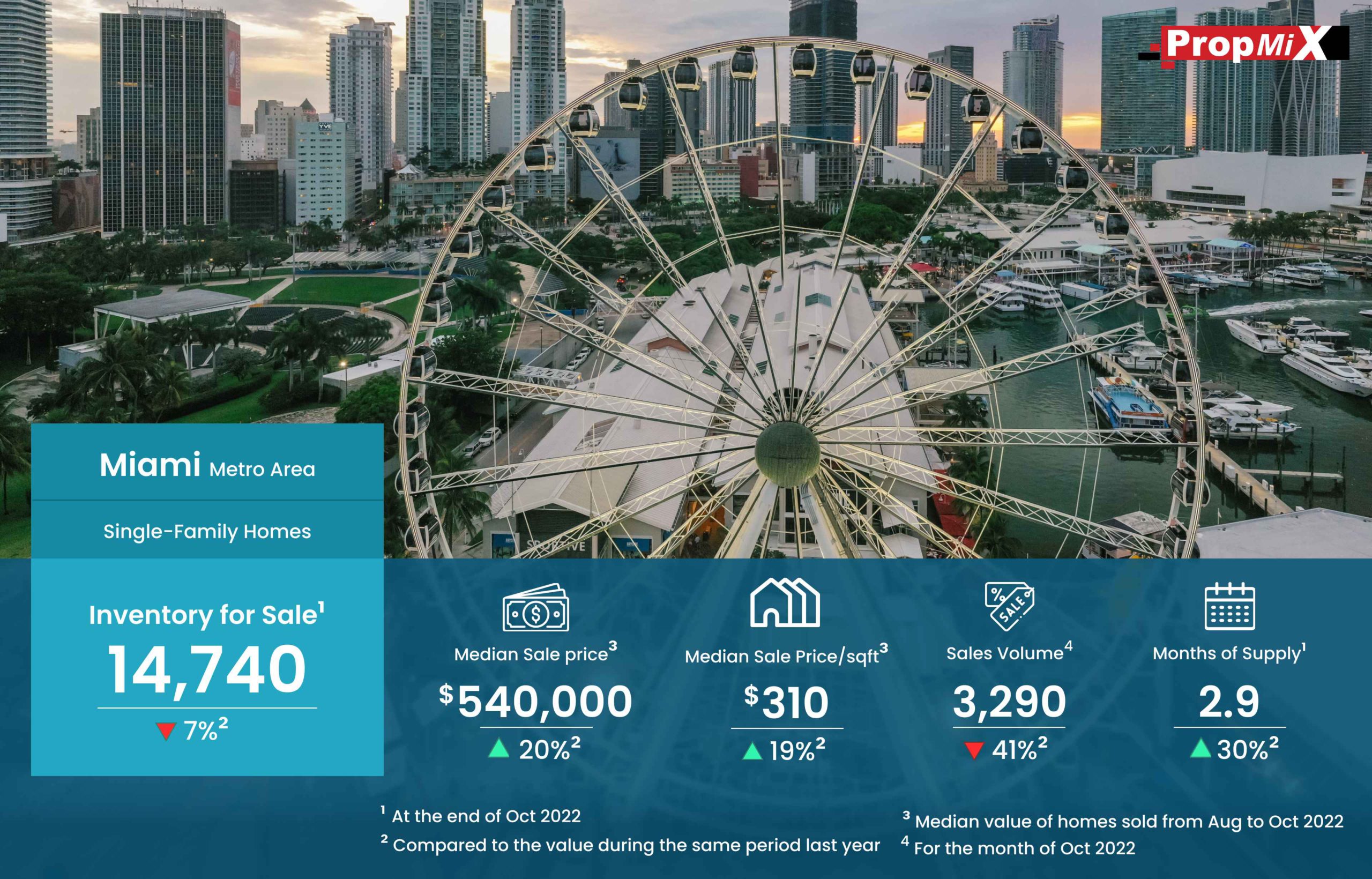 Inventory For Sale Down by 7% in Miami Metro Area in October 2022 11/23/2022 PropMix Data Analytics Team Market Insights 0 The inventory for sale by the end of October 2022 in the Miami metro area was 14,740, down by 7% over October 2021. Learn more about the metrics in PropMix Market Insights.