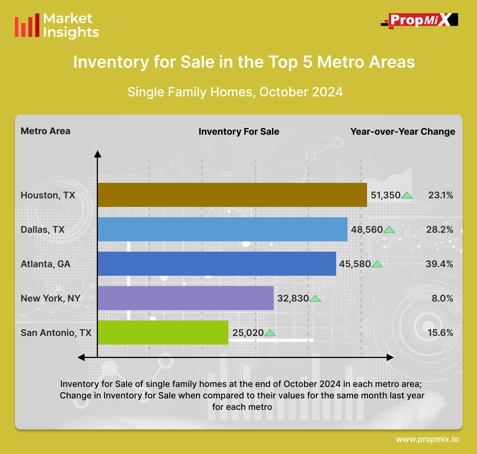 Among the top 30 U.S. metro areas, in October 2024, the Houston metro area had the highest inventory for sale of 51,350, reflecting a 23.1% YoY increase. The Dallas metro area followed with an inventory of 48,560, up 28.2% YoY. The Atlanta metro area recorded 45,580 units, showing a significant rise of 39.4% YoY and the New York metro area reported an inventory of 32,830, showing a modest 8% growth, while the San Antonio metro area had a value of 25,020 with 15.6% YoY change.