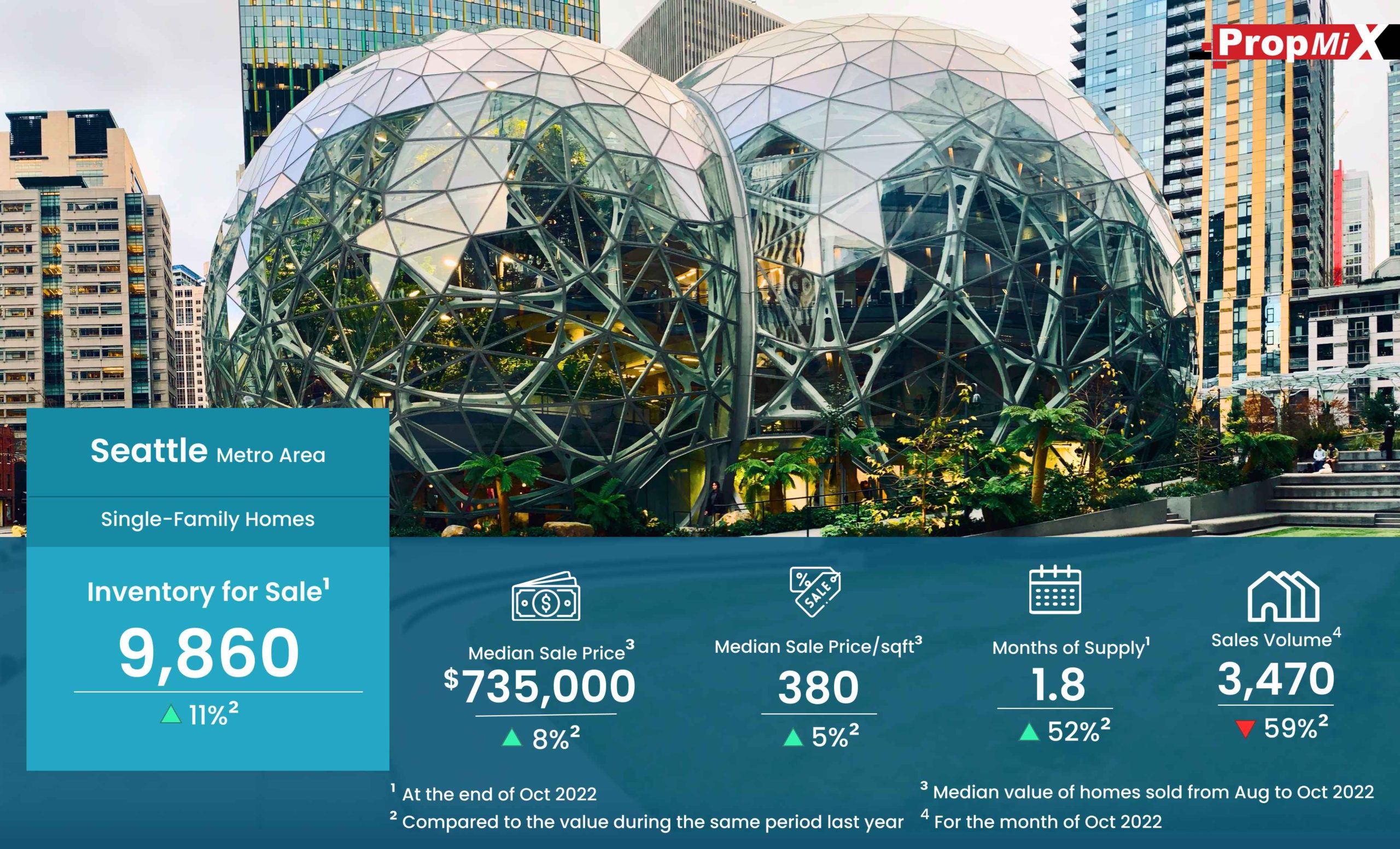 Inventory For Sale Up by 11% in Seattle Metro Area in October 2022 11/25/2022 PropMix Data Analytics Team Market Insights 0 The inventory for sale by the end of October 2022 in the Seattle metro area was 9,860, up by 11% over October 2021. Learn more about the metrics in PropMix Market Insights.