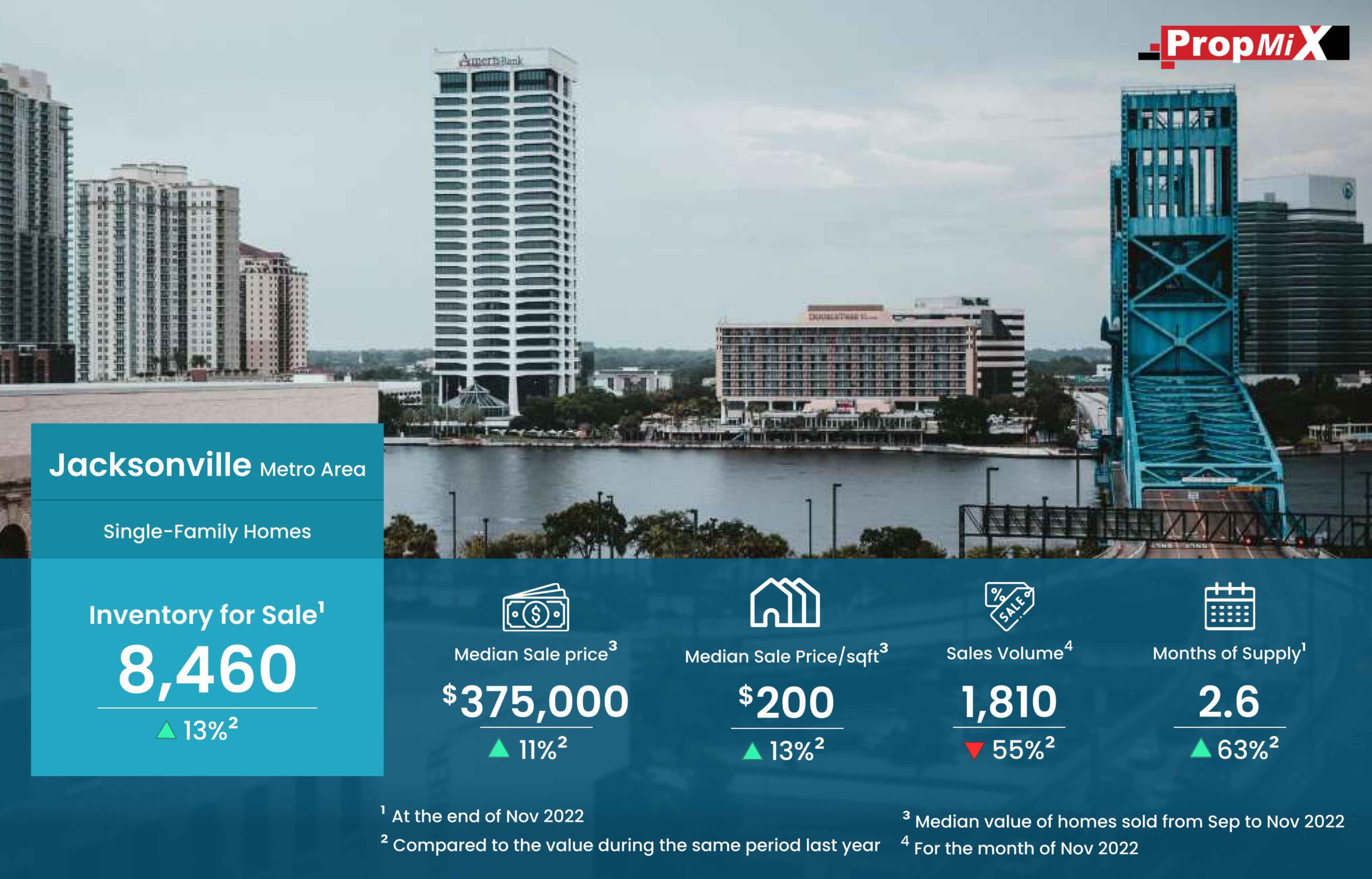 The inventory for sale by the end of November 2022 in the Jacksonville metro area was 8,460, up by 13% over November 2021.