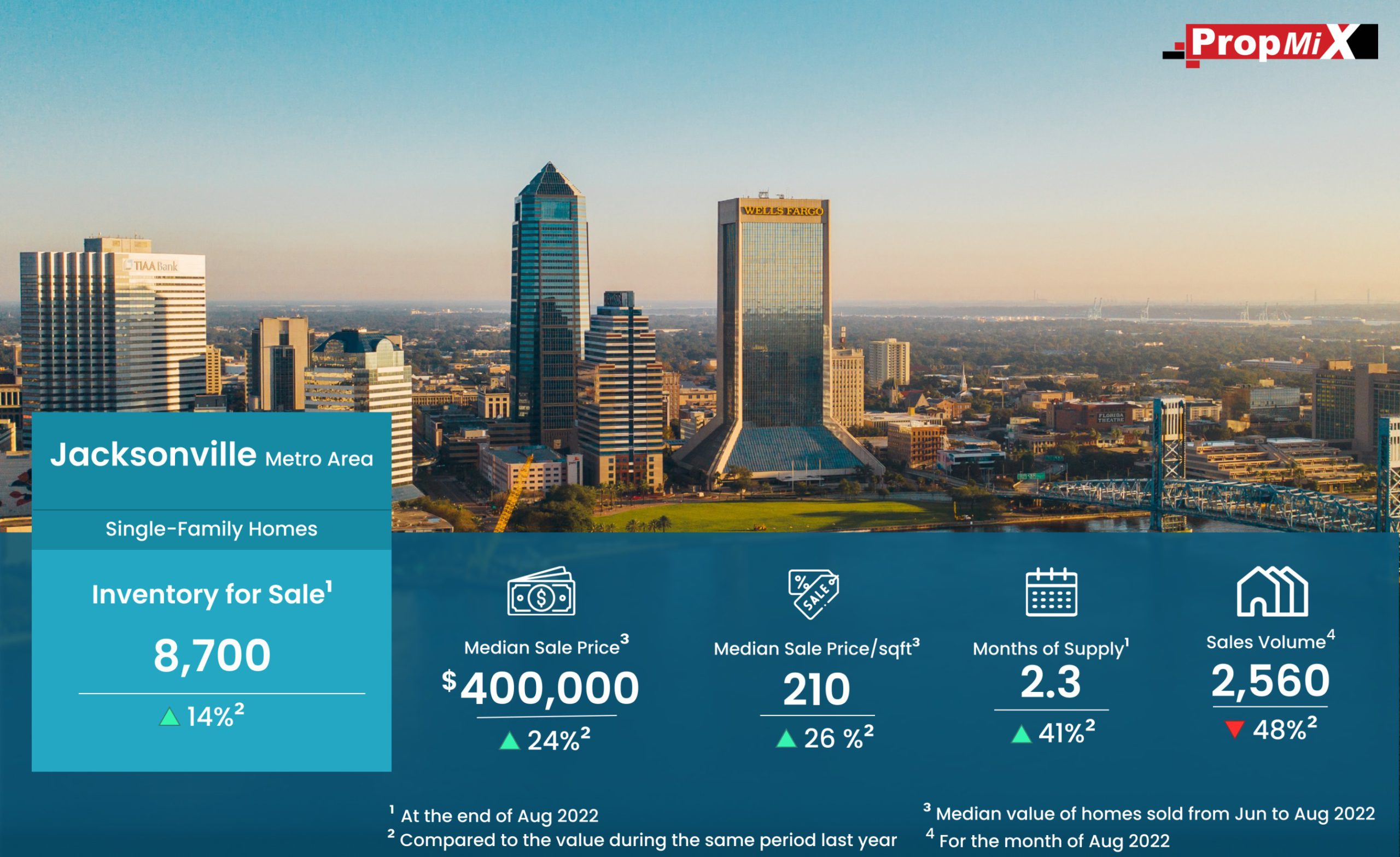Inventory For Sale Up by 14% in Jacksonville Metro Area in August 2022 09/28/2022 PropMix Data Analytics Team Market Insights 0 The inventory for sale by the end of August 2022 in the Jacksonville metro area was 8,700, up by 14% over July 2021. Learn more about the metrics in PropMix Market Insights.