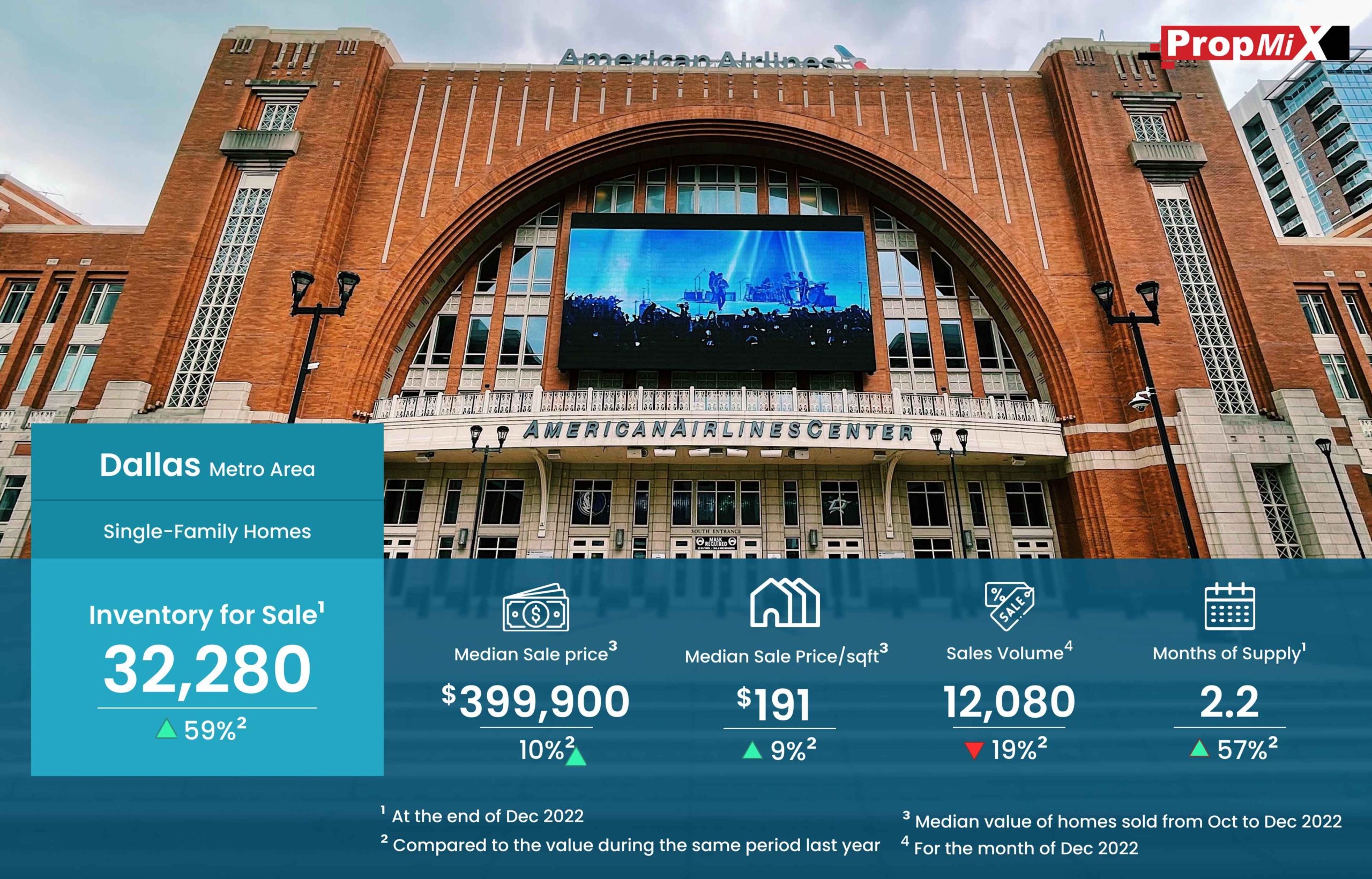 Inventory For Sale Up by 59% in Dallas Metro Area in December 2022 01/07/2023 PropMix Data Analytics Team Market Insights 0 The inventory for sale by the end of December 2022 in the Dallas metro area was 32,280, up by 59% over December 2021. Learn more about the metrics in PropMix Market Insights.