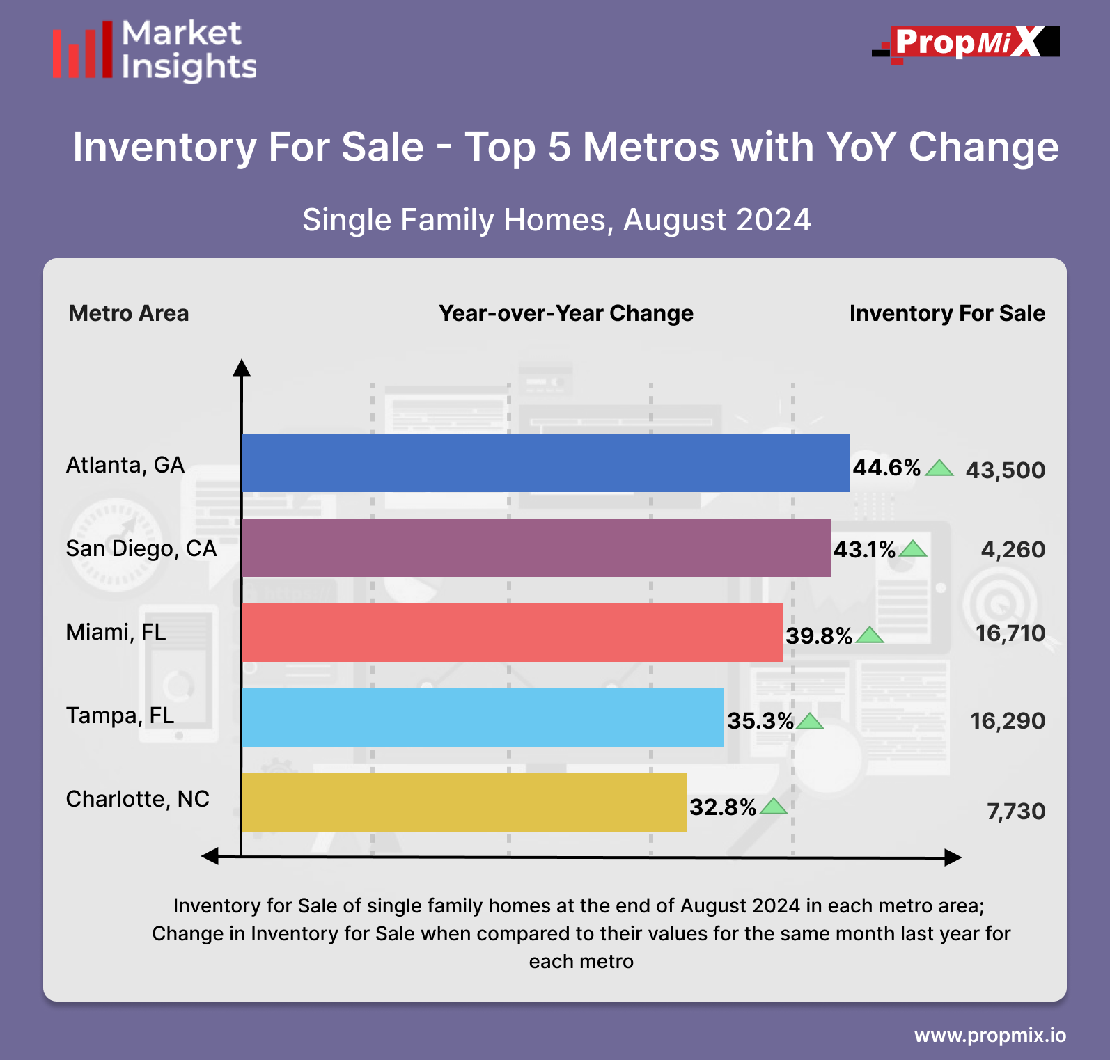 For a detailed view of all 30 metro areas that we track and more insights, visit our Interactive Market Insights page. Learn more about the metrics in PropMix Market Insights.