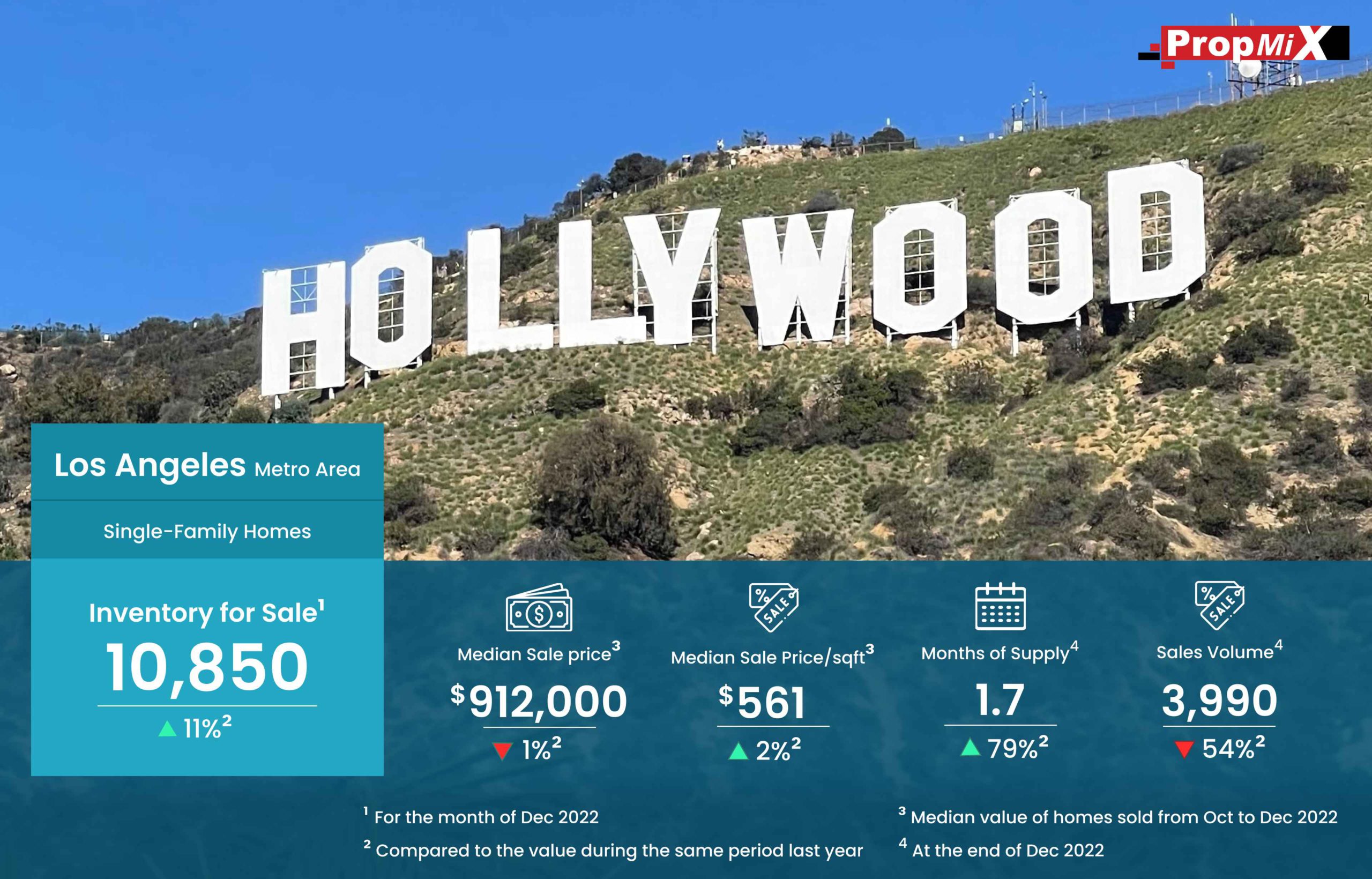 Los Angeles Metro Area Rose by 11% in Inventory For Sale During December 2022 01/23/2023 PropMix Data Analytics Team Market Insights 0 The inventory for sale for Los Angeles metro area was 10,850 by the end of December 2022, up by 11% over December 2021. Meanwhile, sales volume took a dip of 54% during the same period. Learn more about the metrics in PropMix Market Insights.