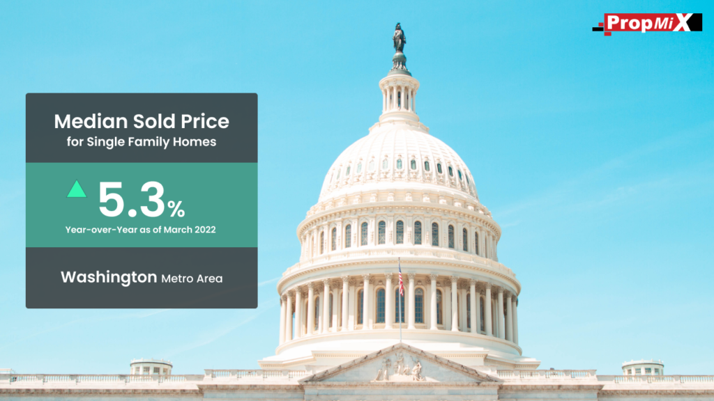 The Median Sale Price for single-family homes in the Washington metro area was $558,000 for the quarter ending March 2022, an increase of 5.3% over the same period in 2021.